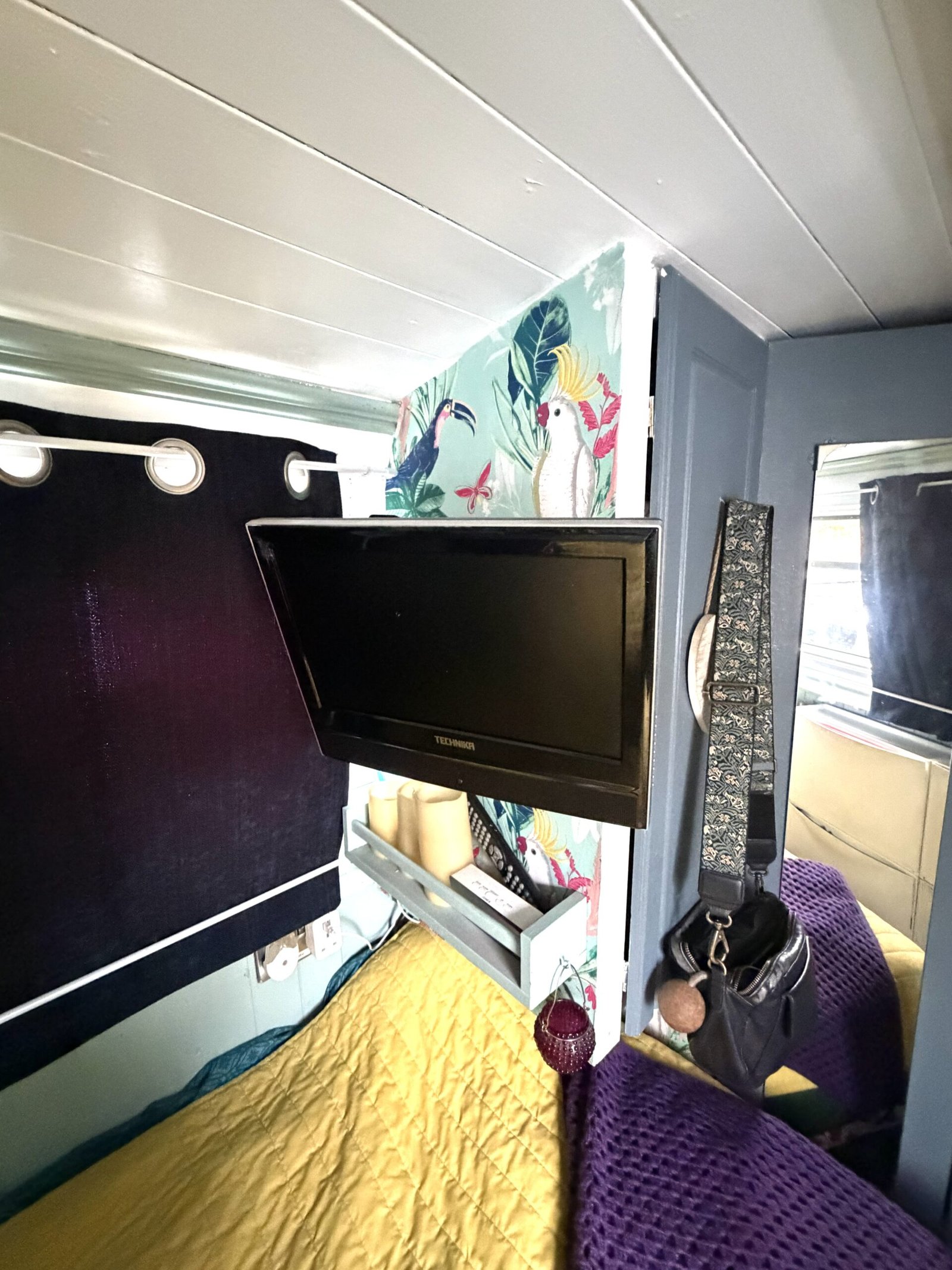 Bedroom: Double bed with storage underneath, wardrobe, Technika tv, mirror, shelves, storage, radiator.