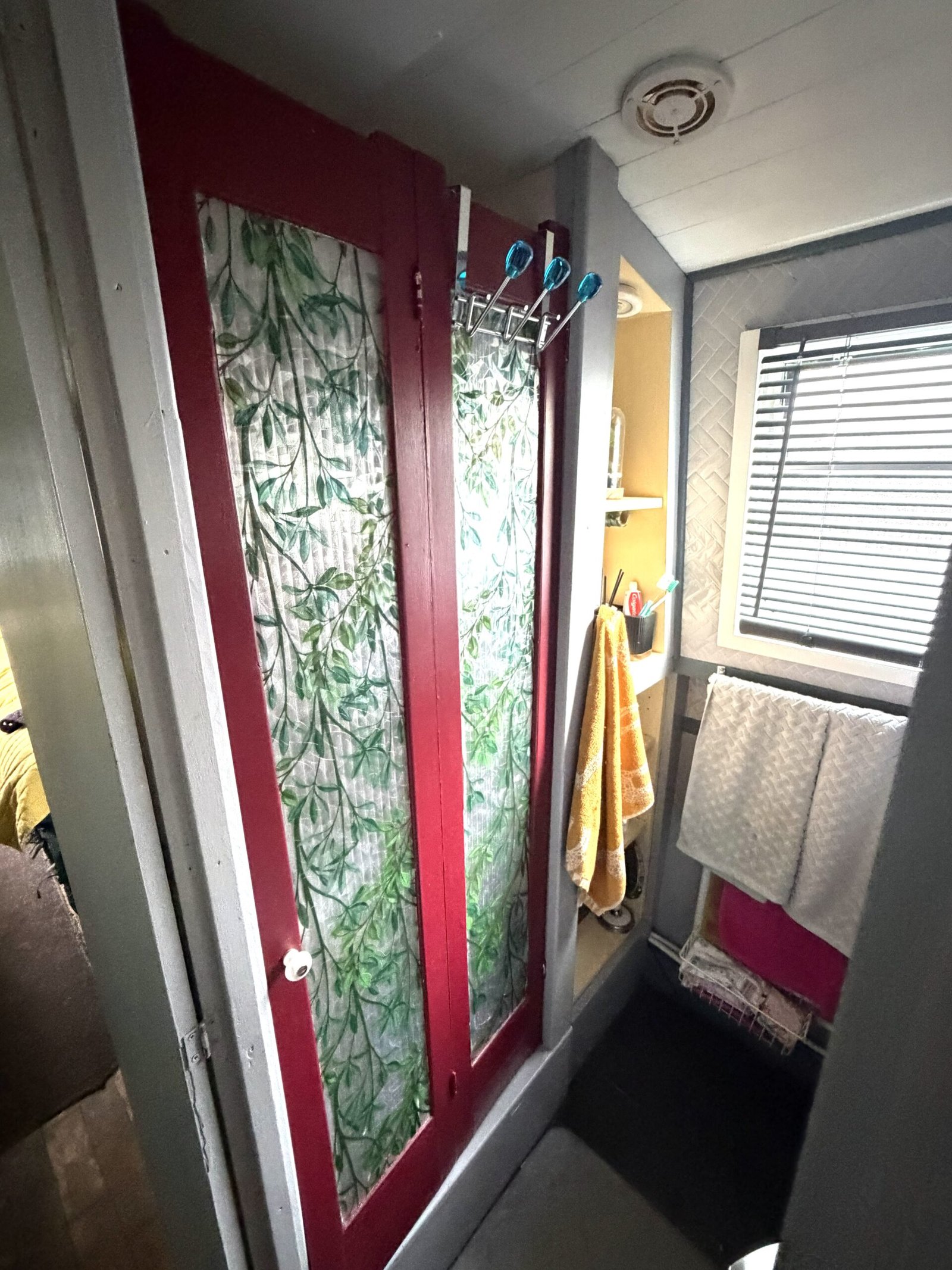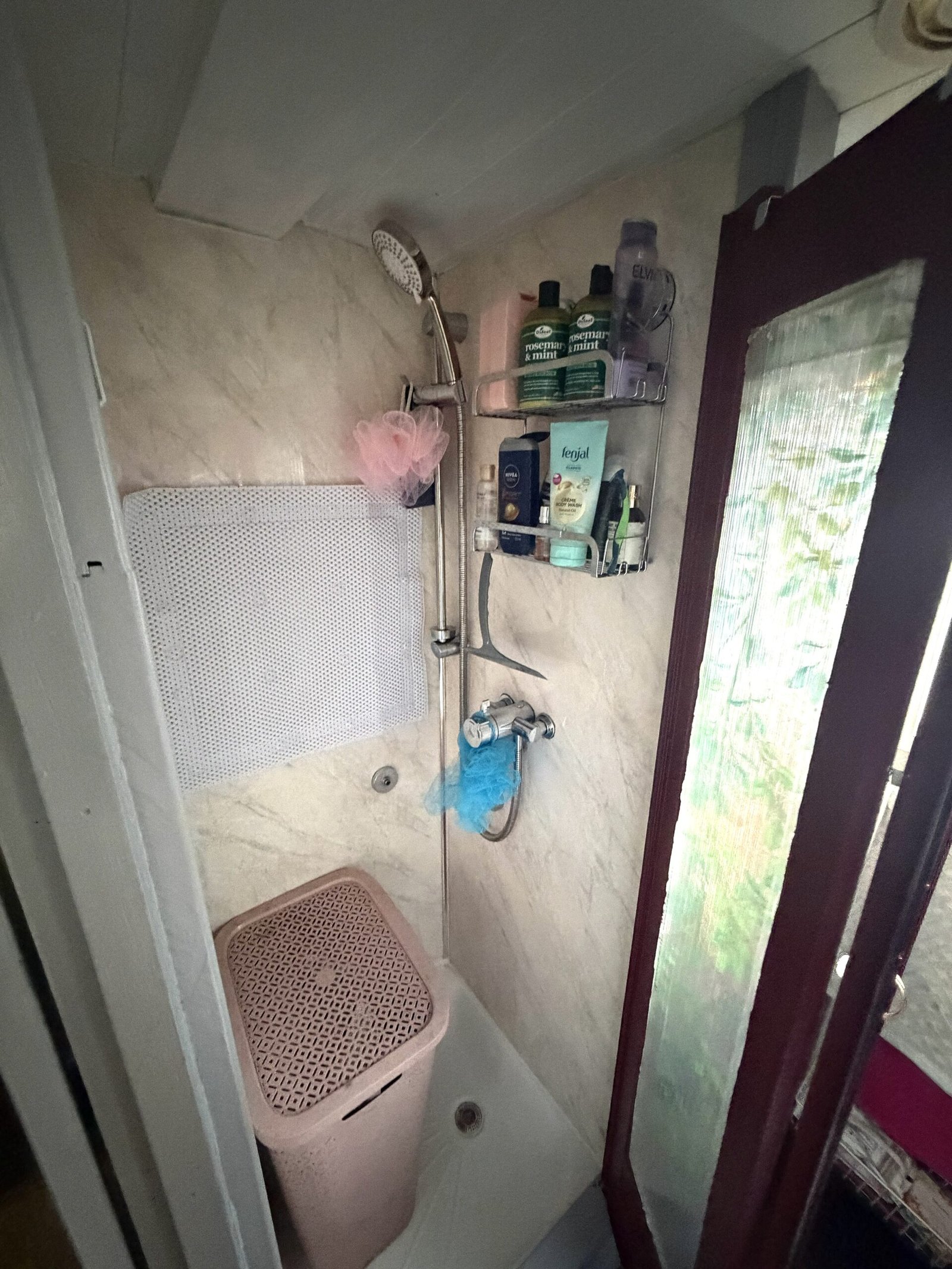 Bathroom: Thetford cassette electric flush toilet, shower enclosure, ceramic wash basin, shelves, heated towel radiator, side hatch & in corridor.