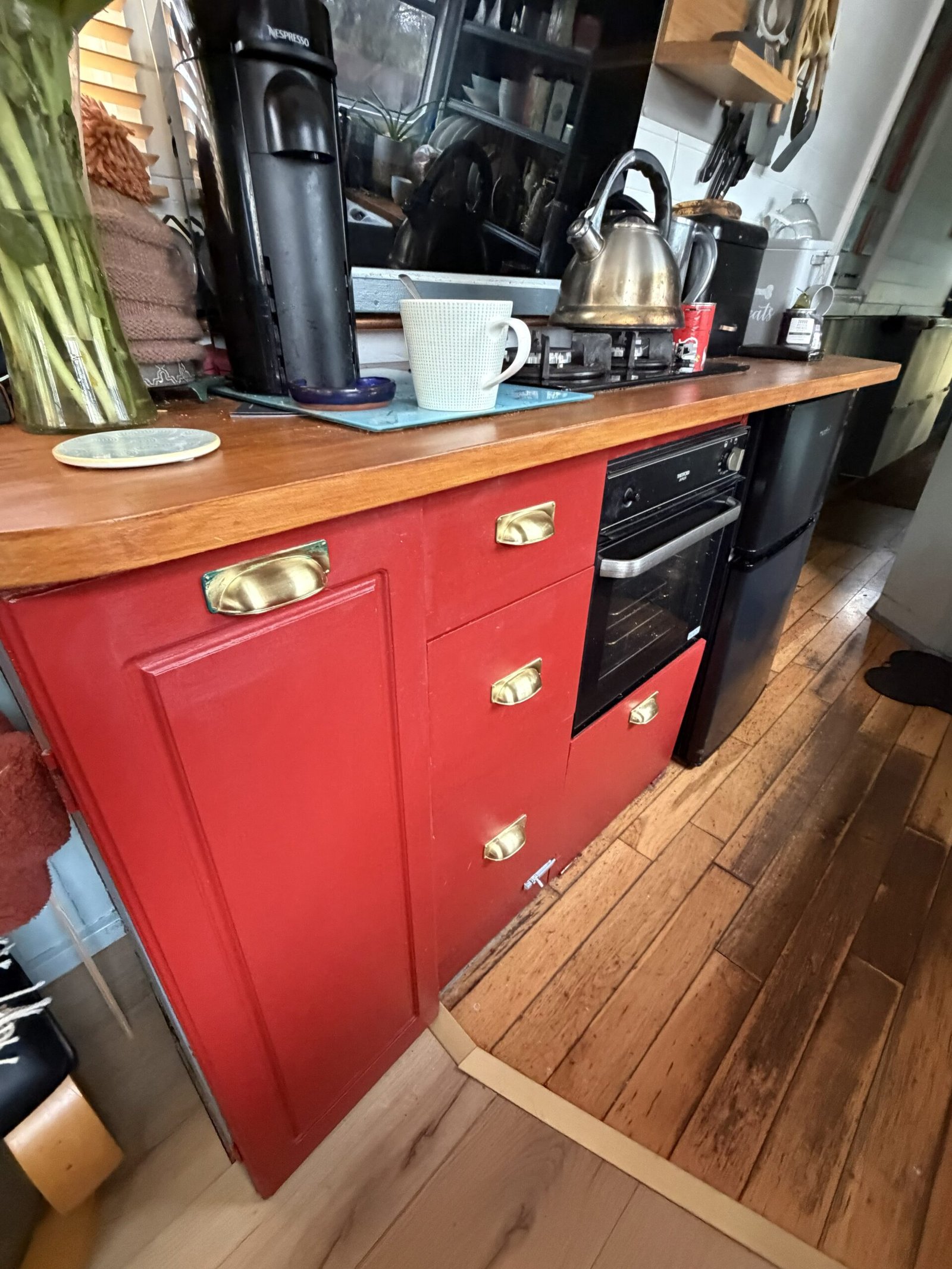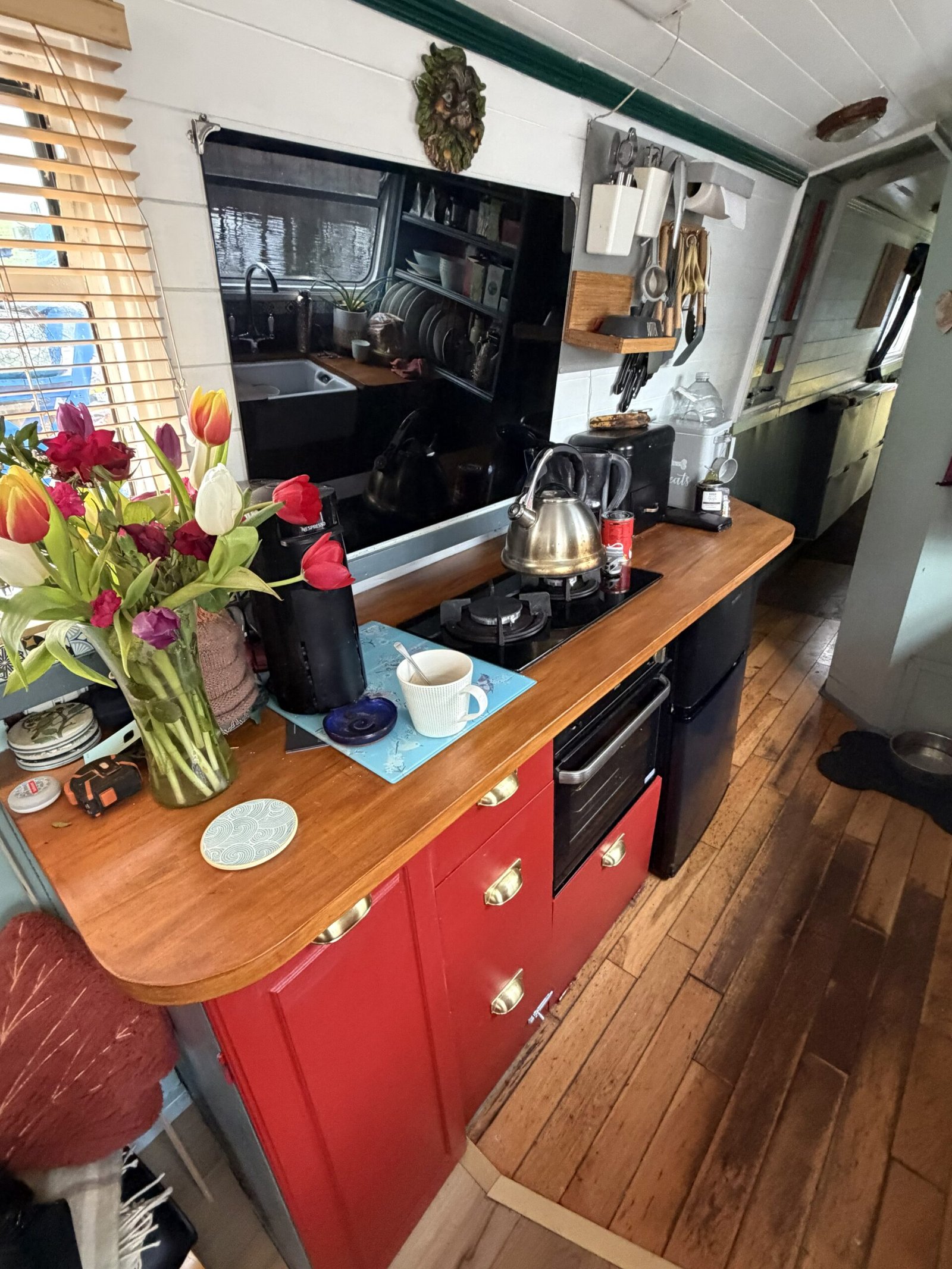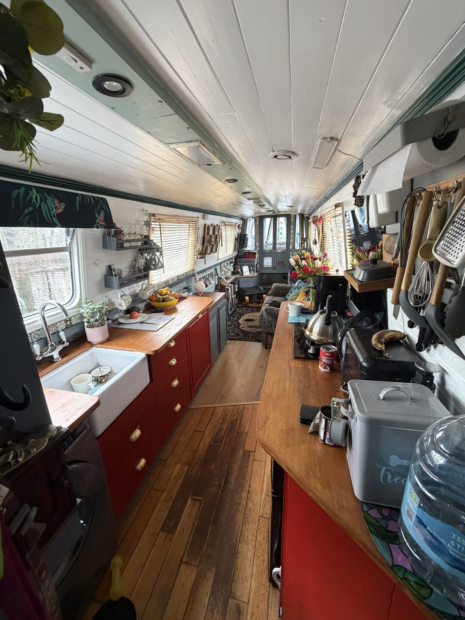 Galley: Thetford Duplex oven & grill, Karinear hob, Comfee fridge, Hoover washing machine, Morso Squirrel stove c/w back boiler, Belfast sink, cupboards, drawers, blinds.