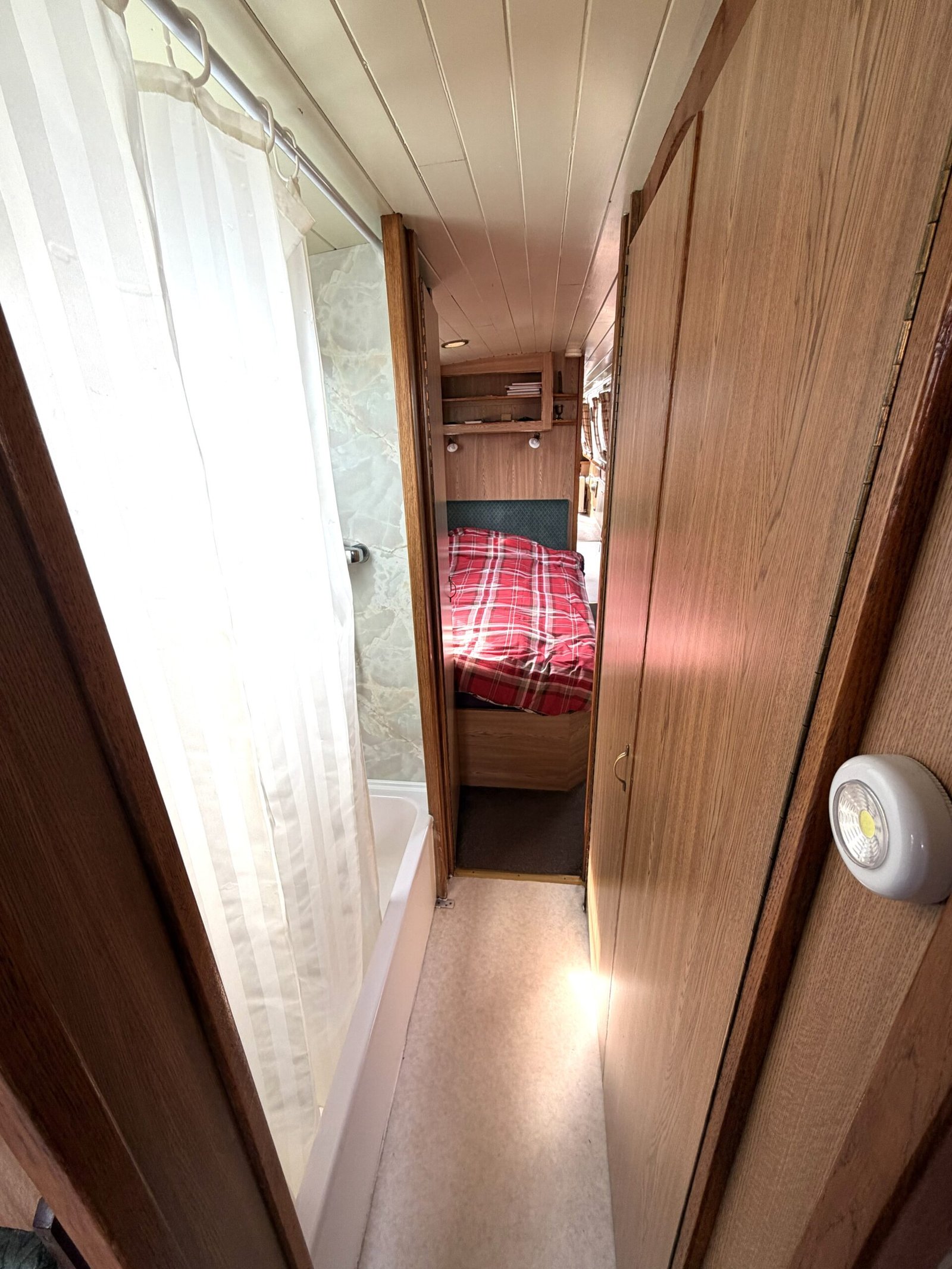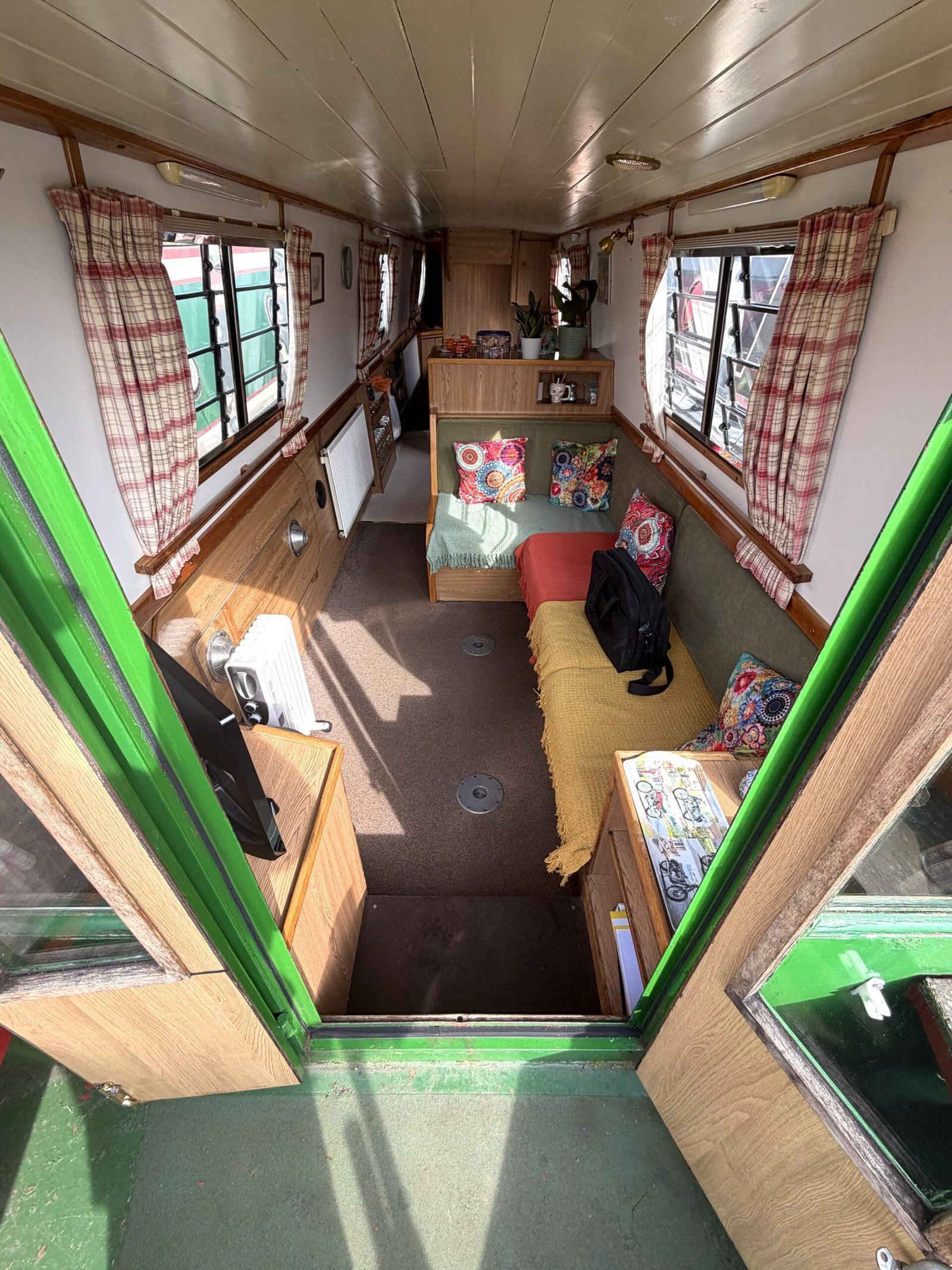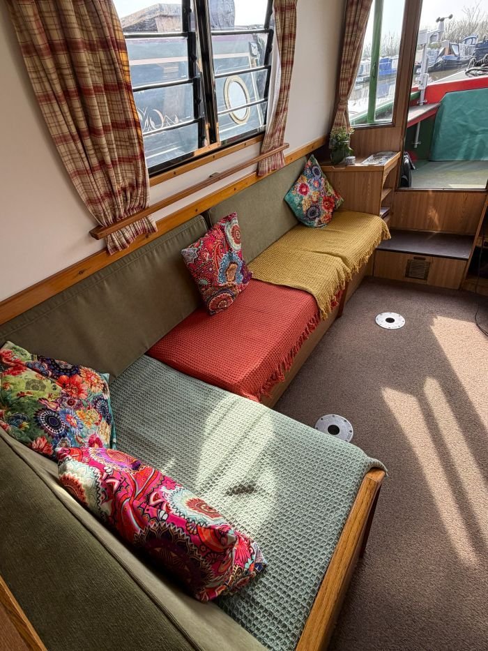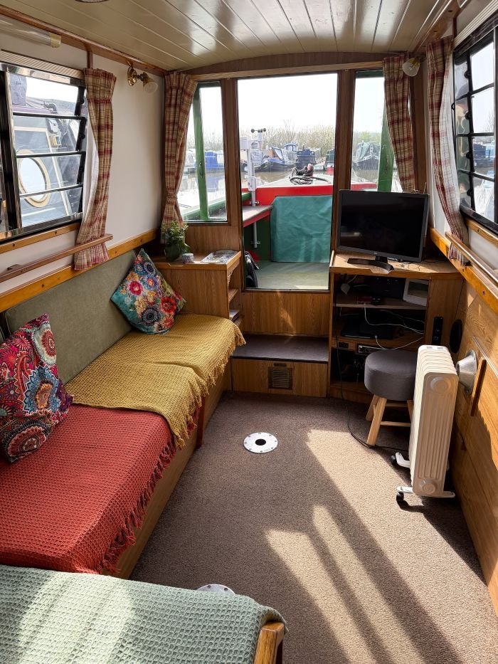 Saloon: L shaped dinette converting to a double berth, LG tv, cupboard, shelf, curtains, carpet, doors to the bow.