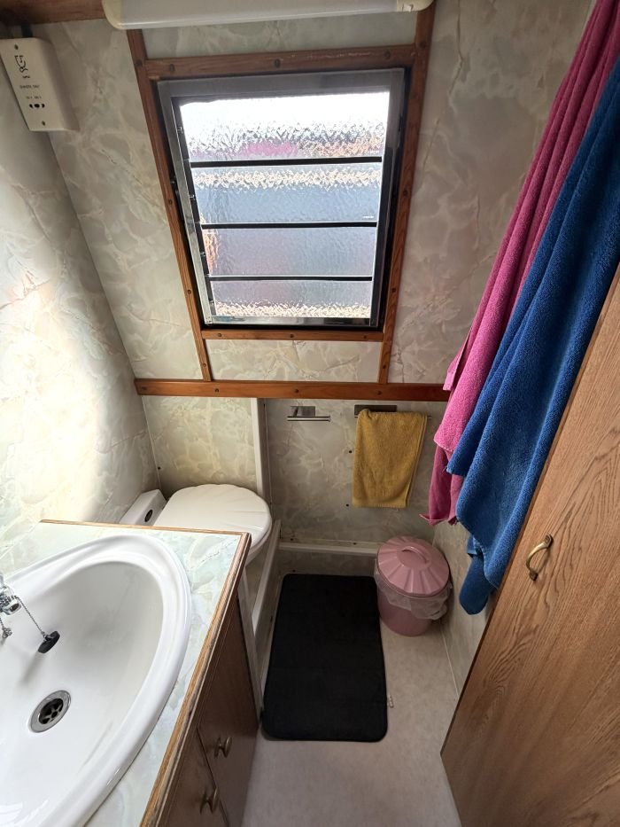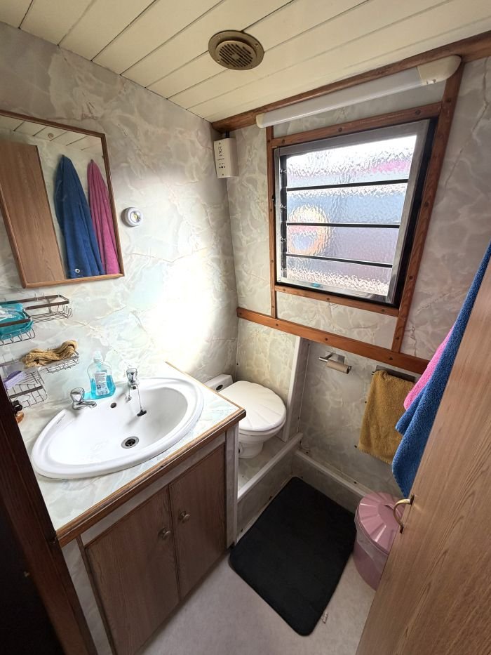 Bathroom: Mansfield Traveler pump out toilet, wash basin & vanity unit, cupboard, mirror.