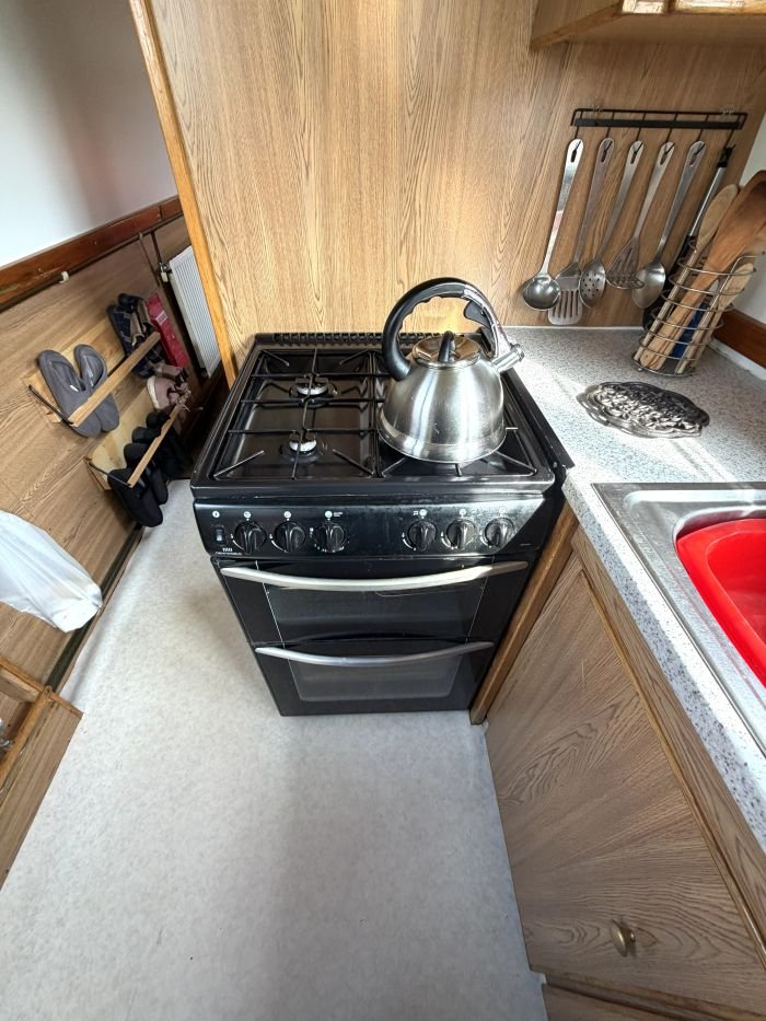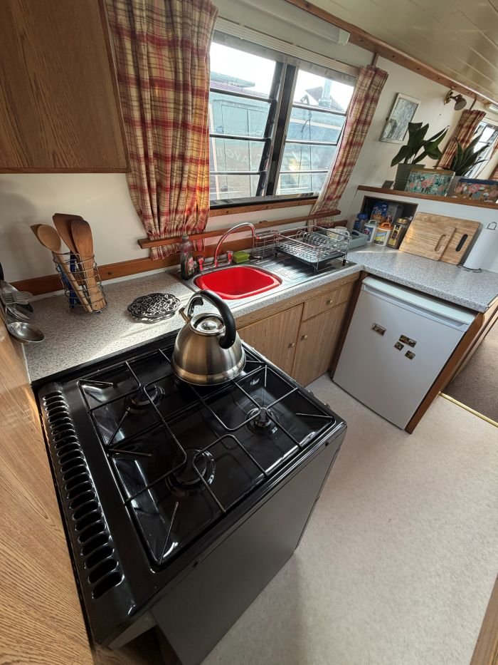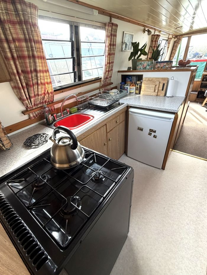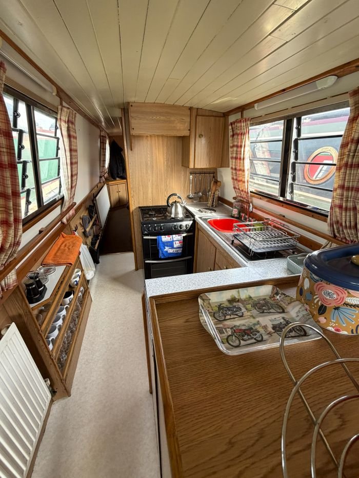 Galley: Fridge, New World cooker, sink & drainer, cupboards, shelves, worktops.