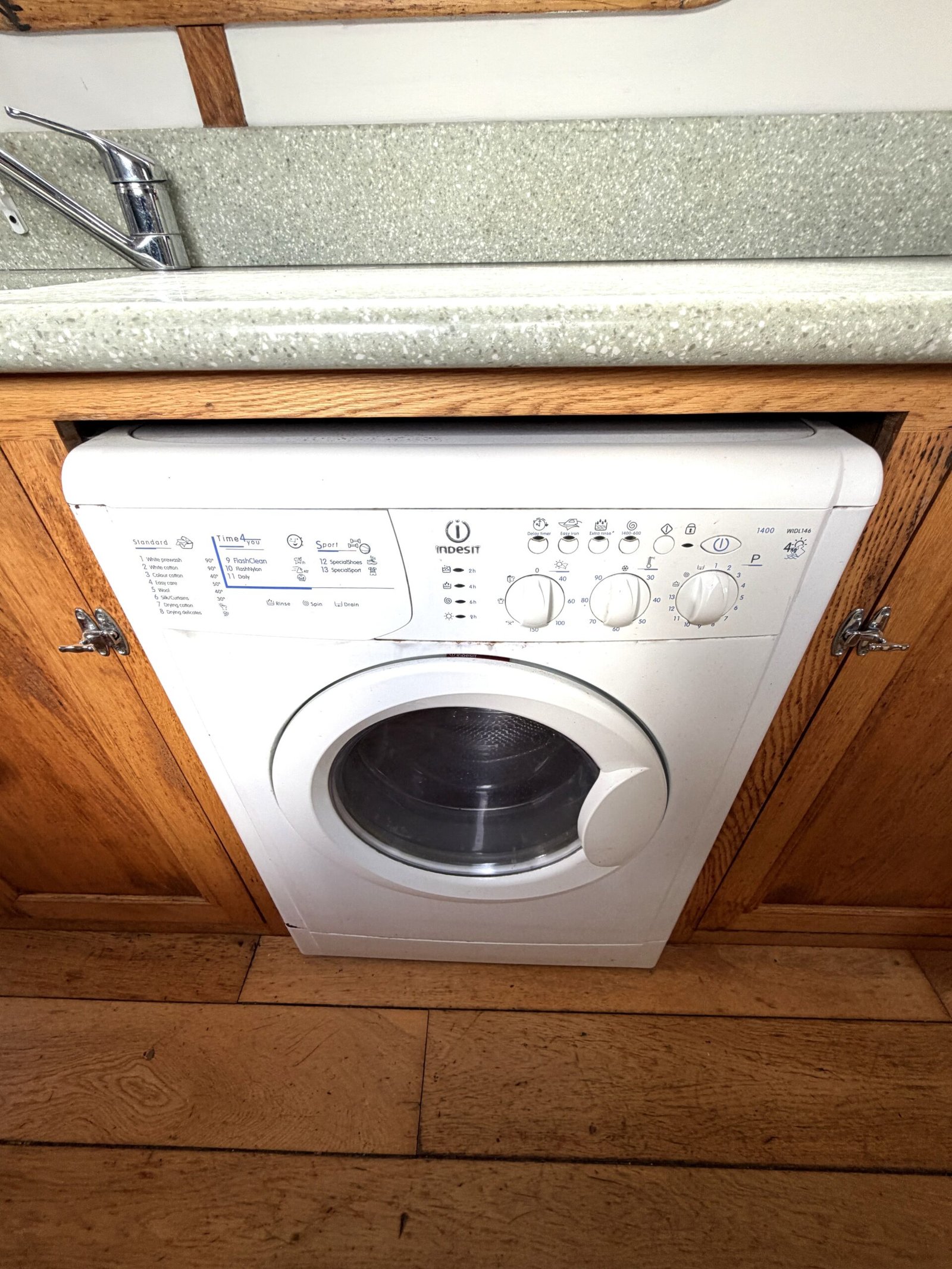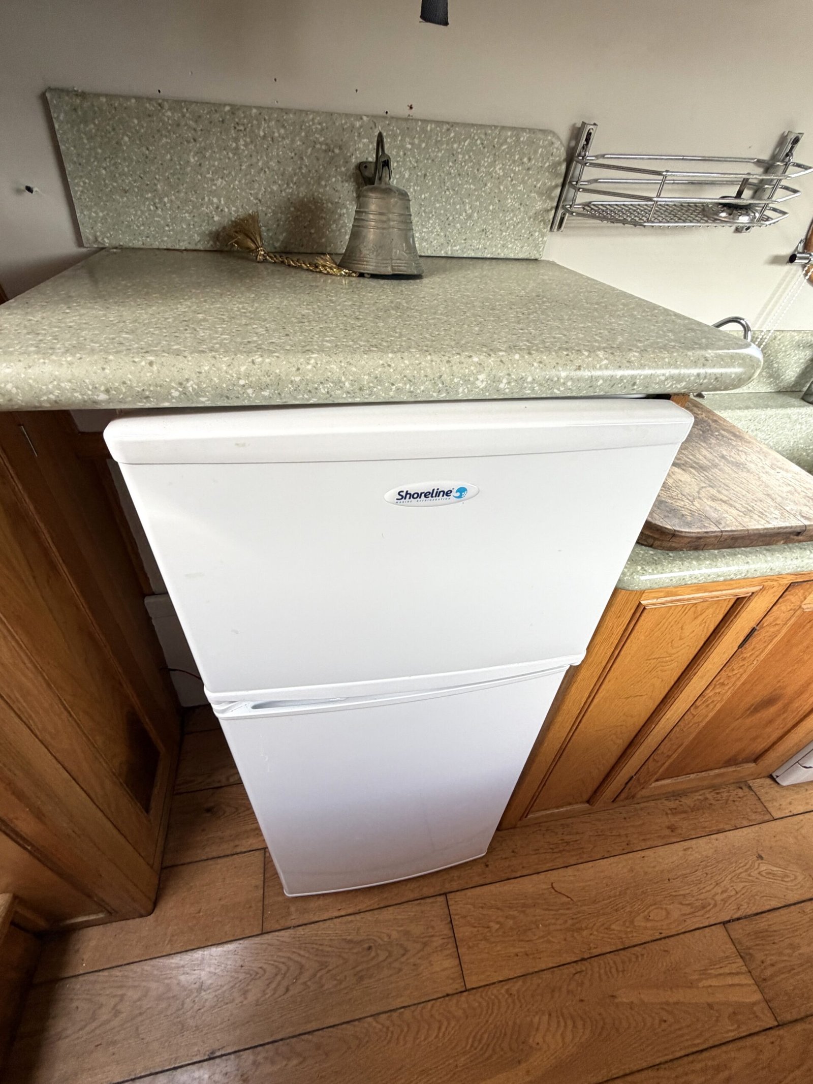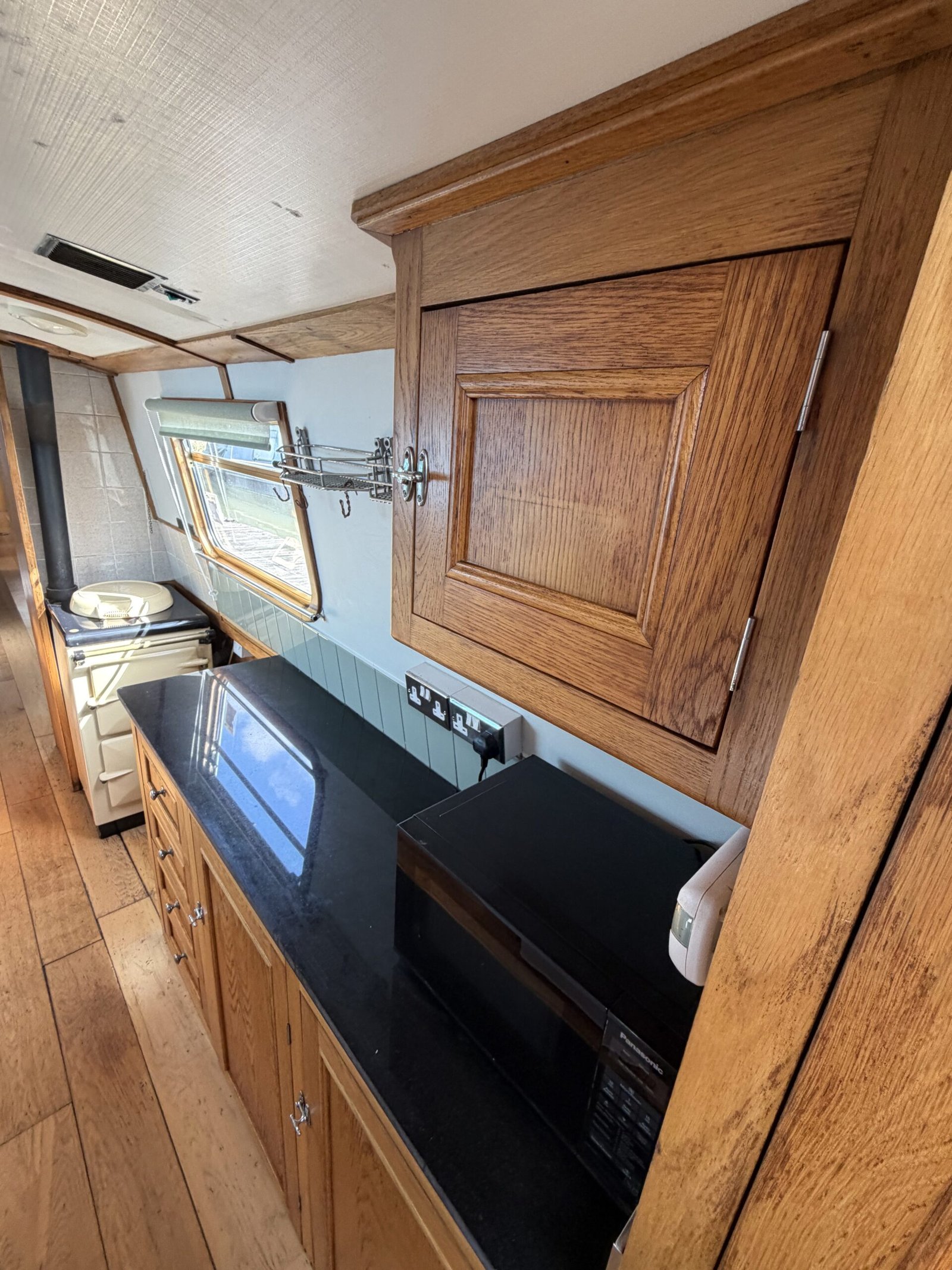 Galley: Heritage cooker, 12v Shoreline fridge, Panasonic microwave, Indesit washing machine, sink, work surfaces, cupboards, drawers, blinds.