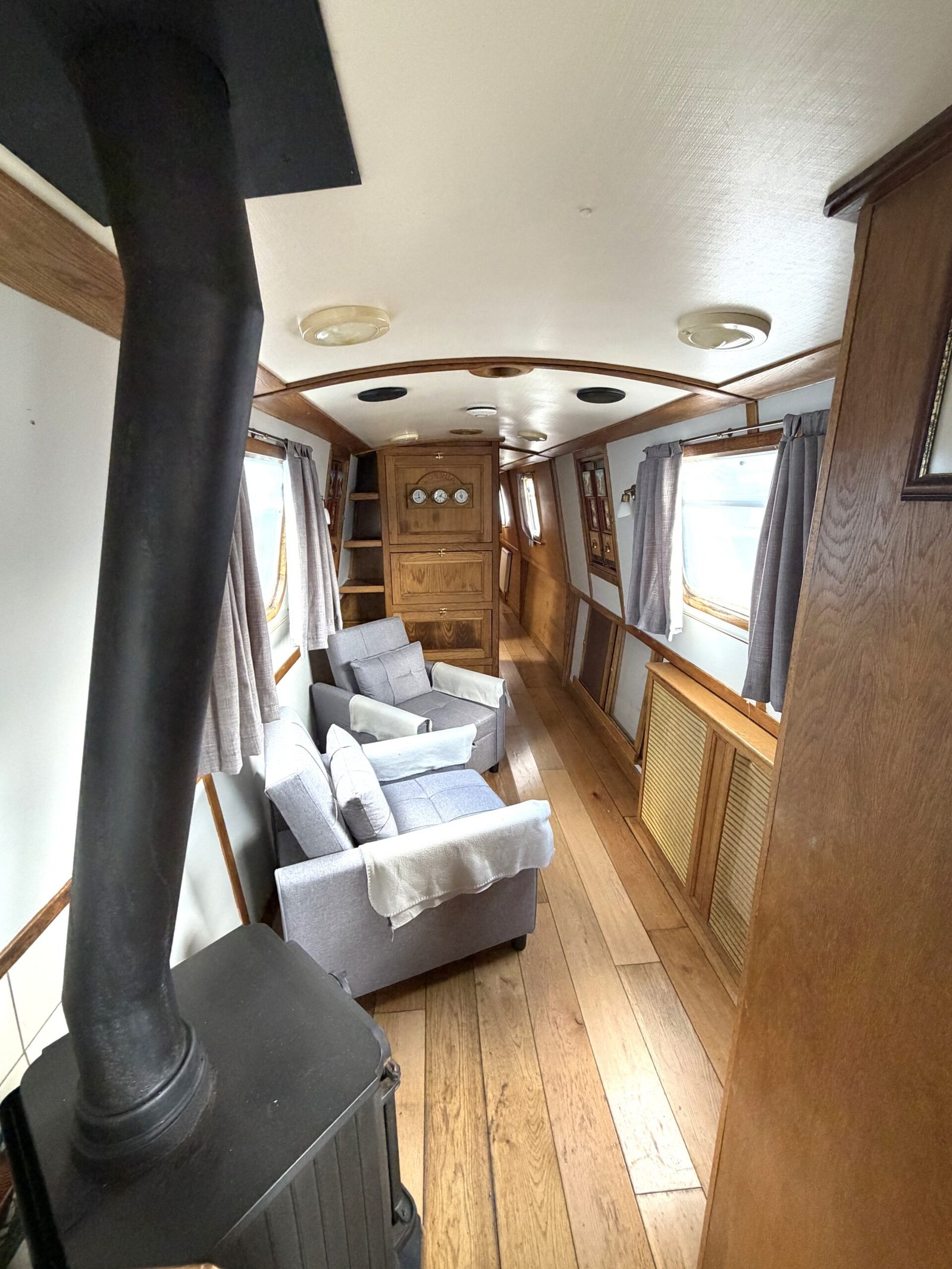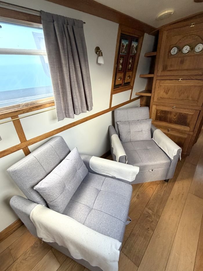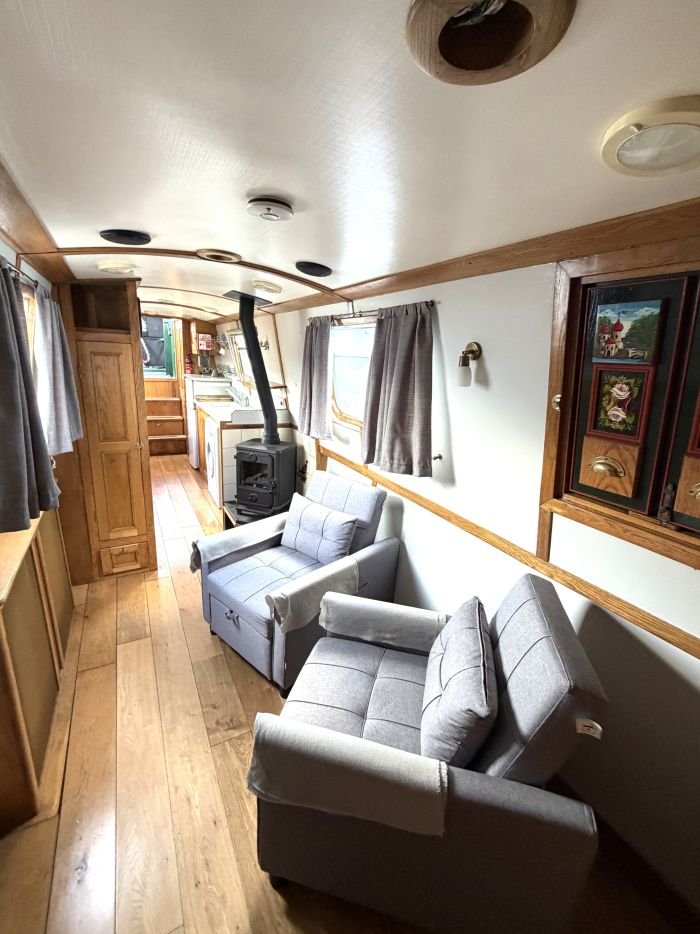 Saloon: Stove, 2 chairs that form single berths, cupboard, shelves, port & starboard side hatches, radiator.