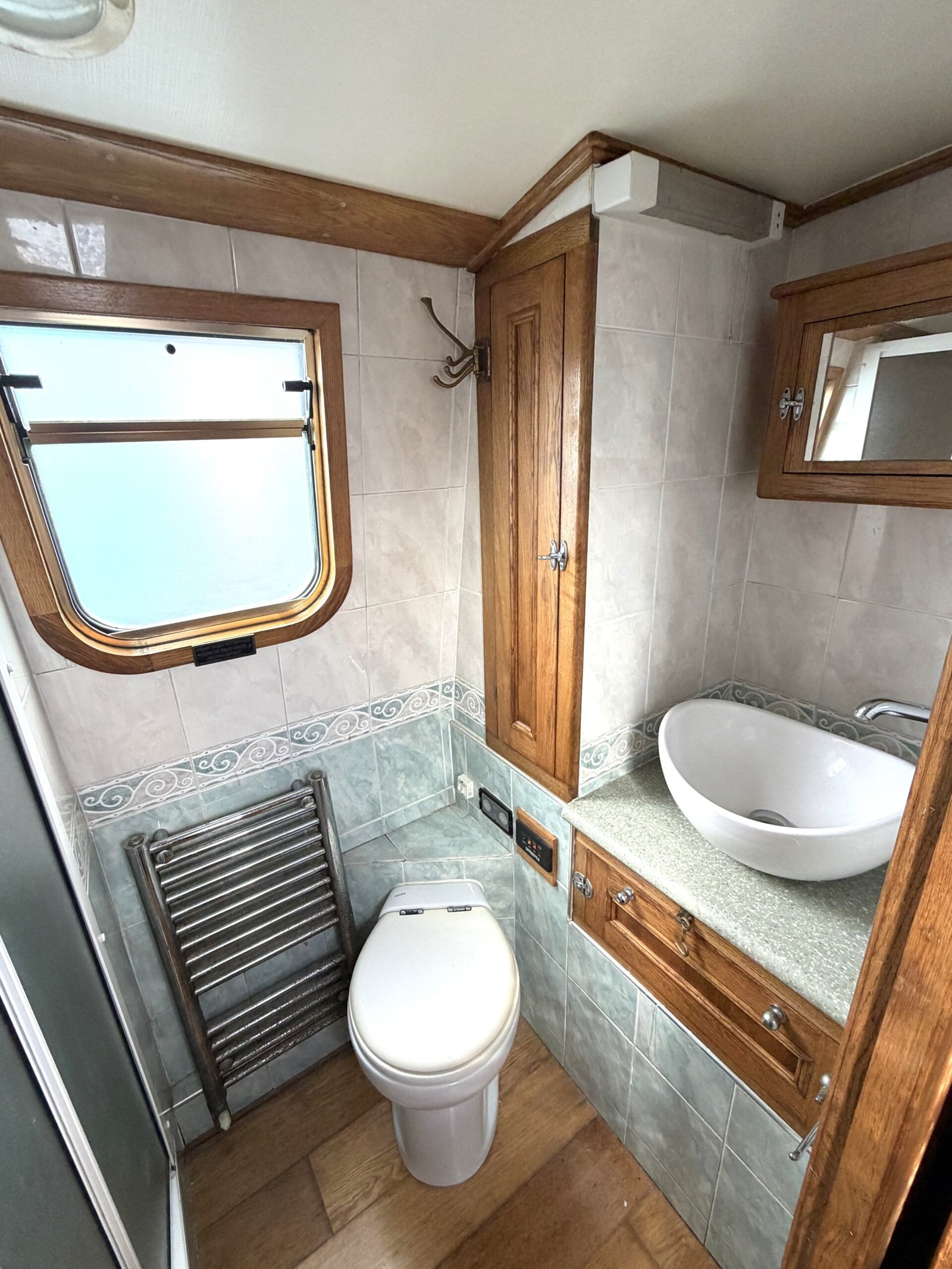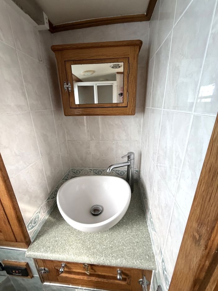 Bathroom: Tecma pump out toilet, shower cubicle, wash basin, heated towel rail, cupboard, mirror.