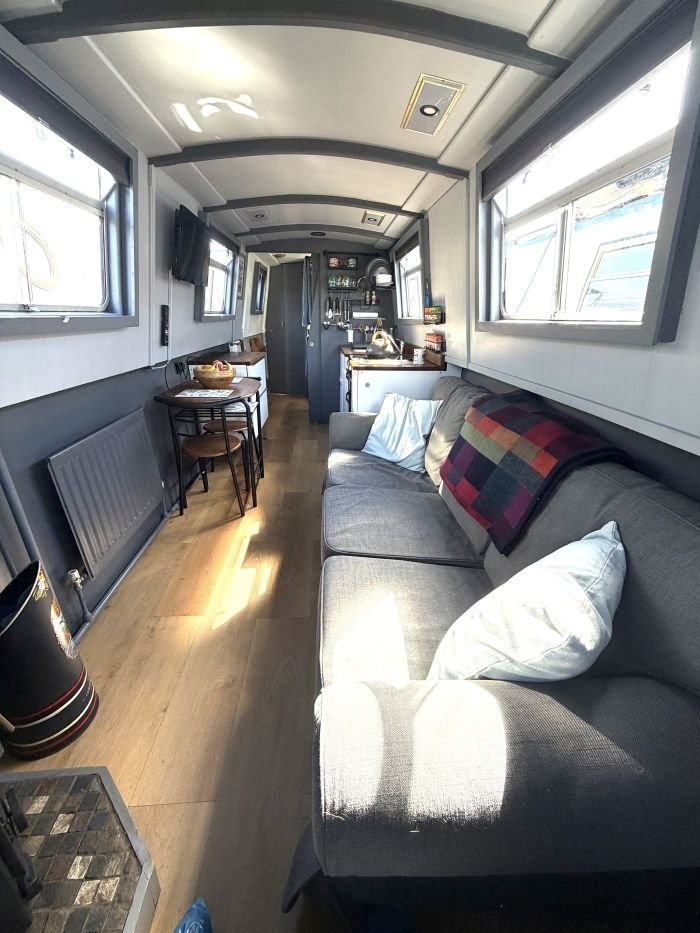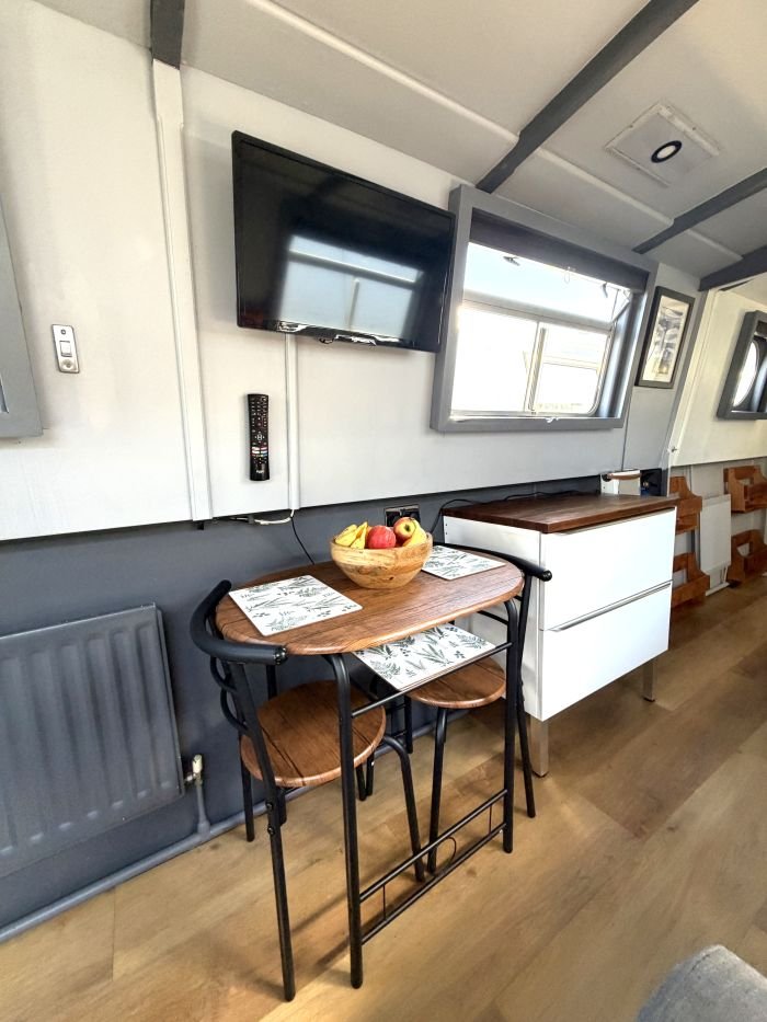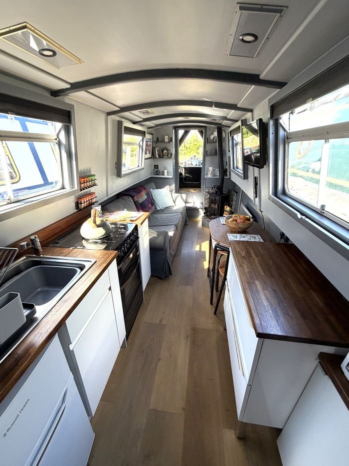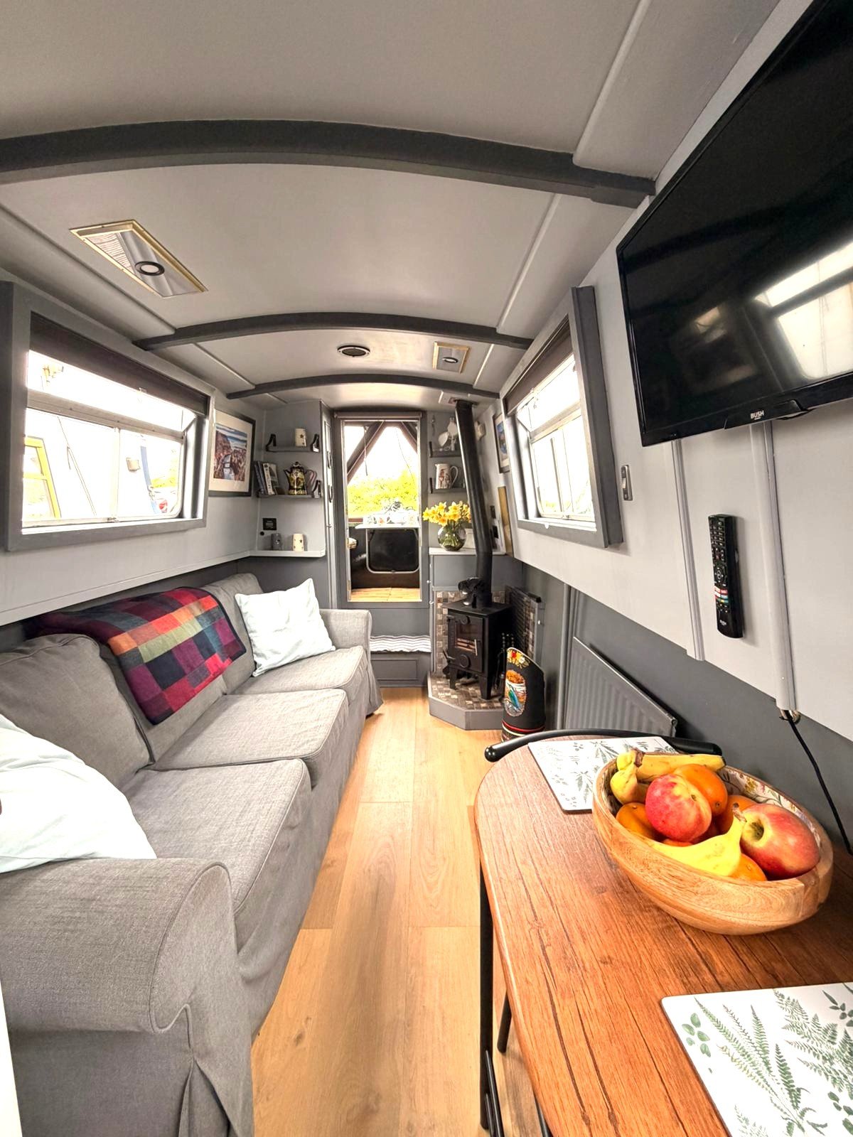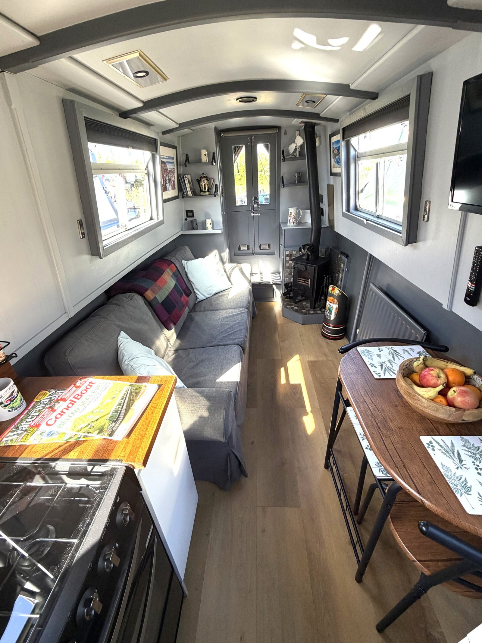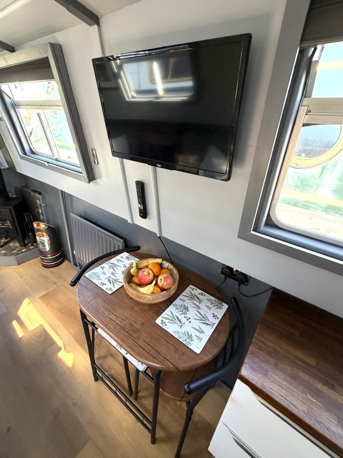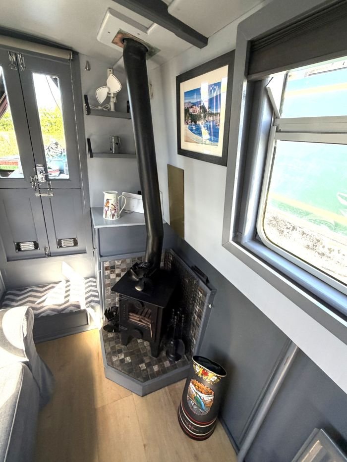 Saloon: Sofa, table & 2 chairs, Bush smart tv, Boatman solid fuel stove, USB charging points, shelves, blinds, radiator, doors to the bow.