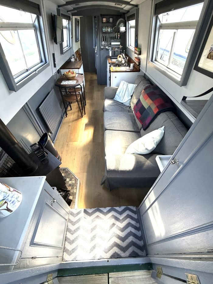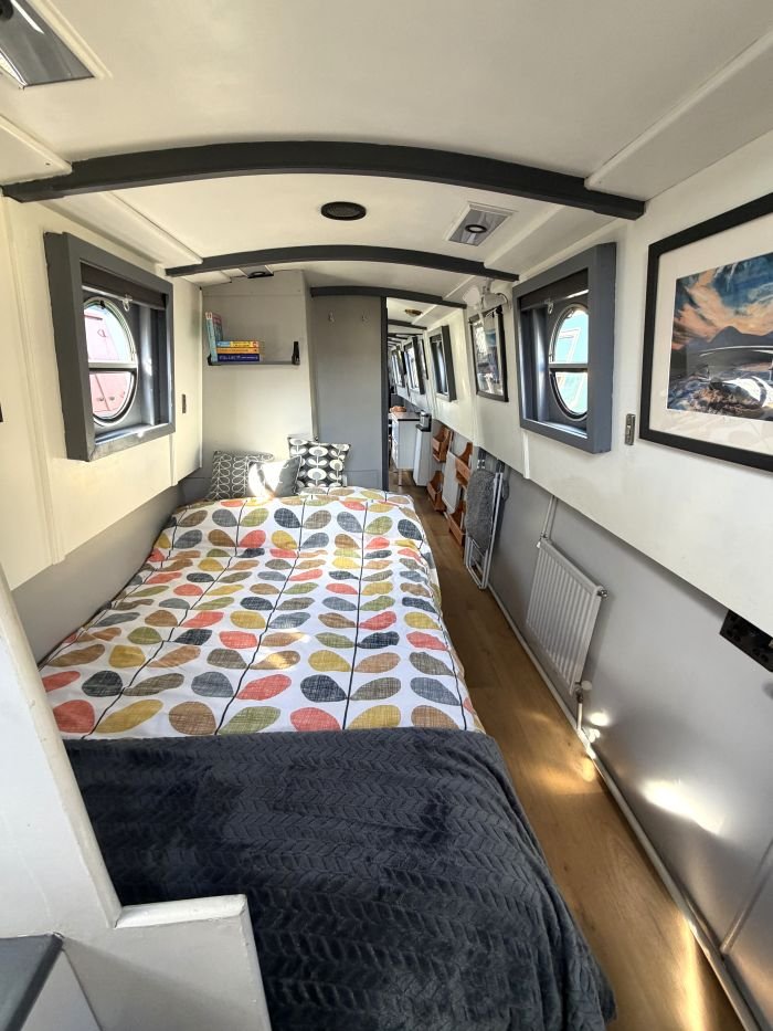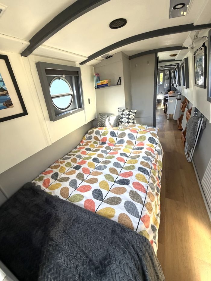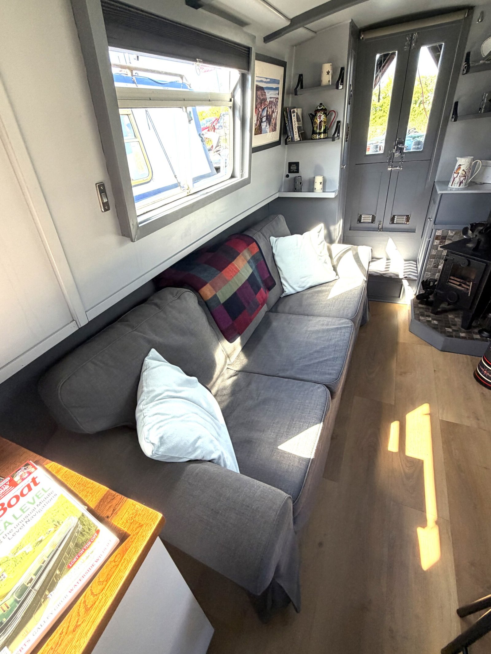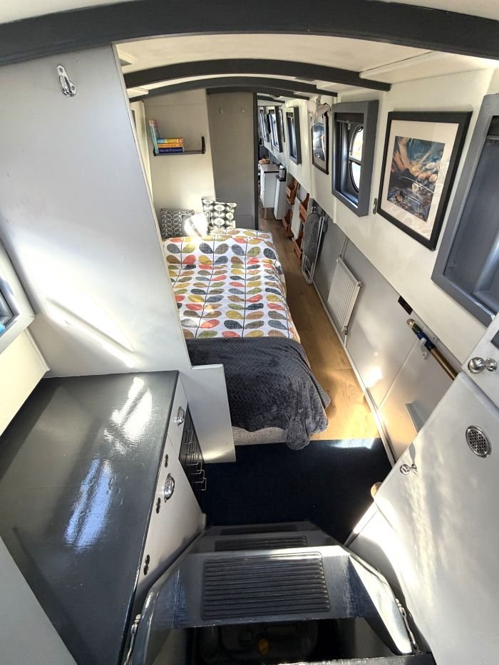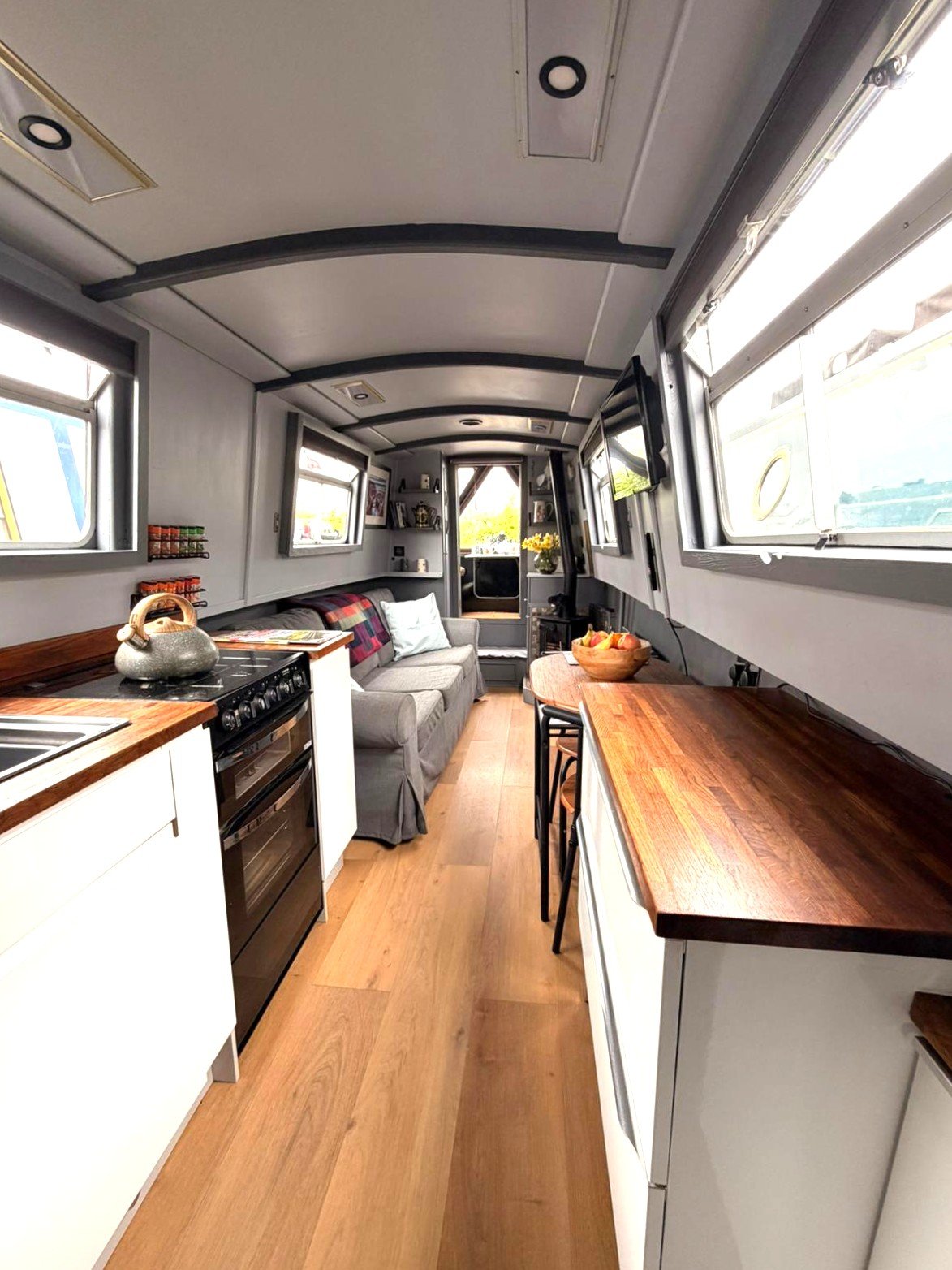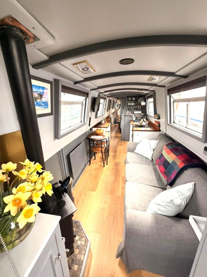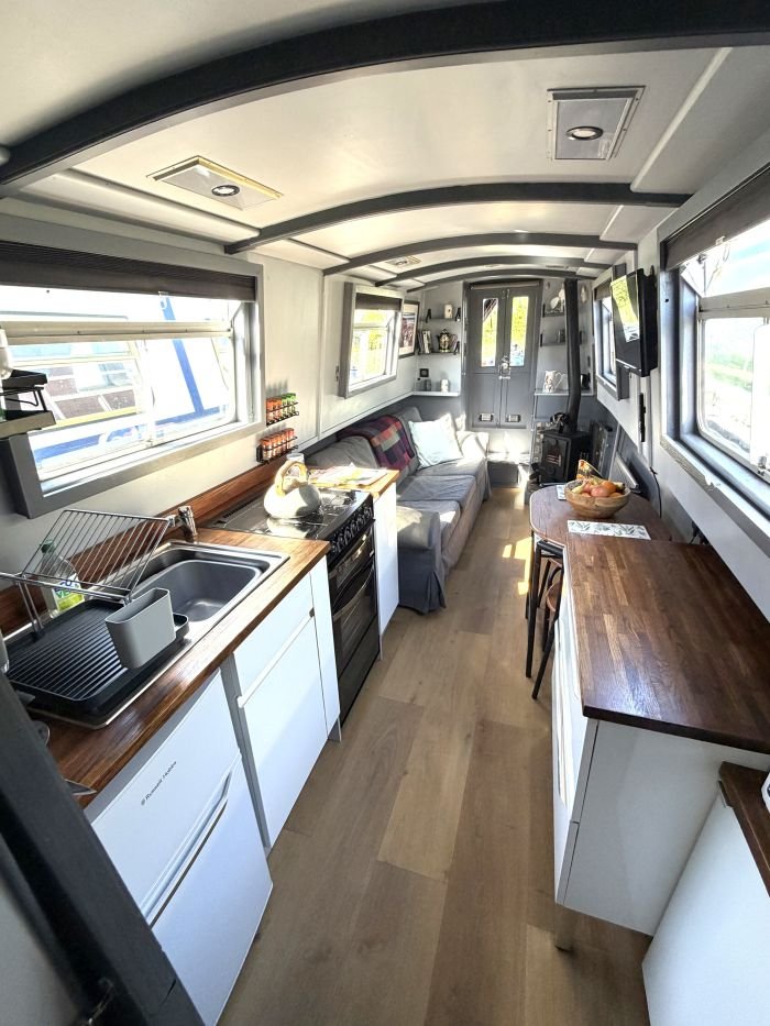 Saloon: Sofa, table & 2 chairs, Bush smart tv, Boatman solid fuel stove, USB charging points, shelves, blinds, radiator, doors to the bow.