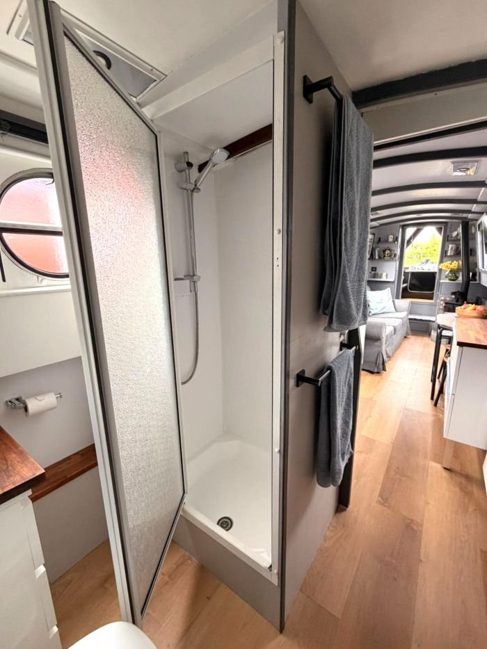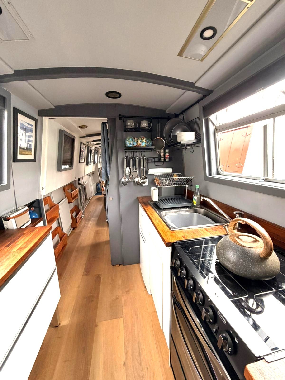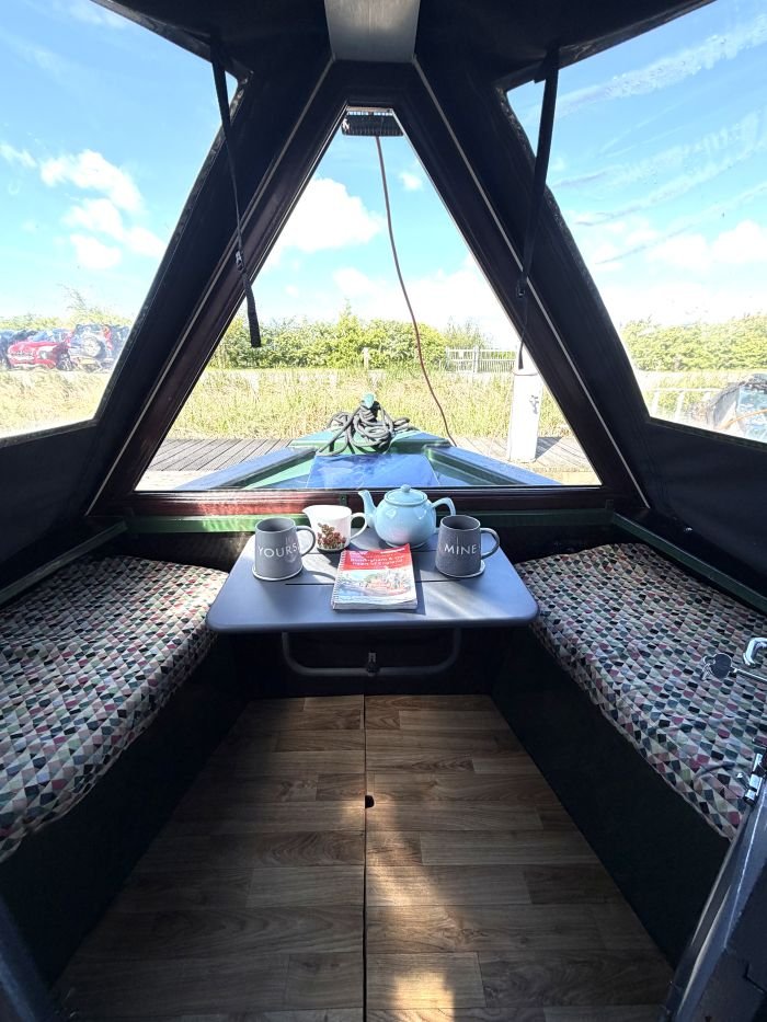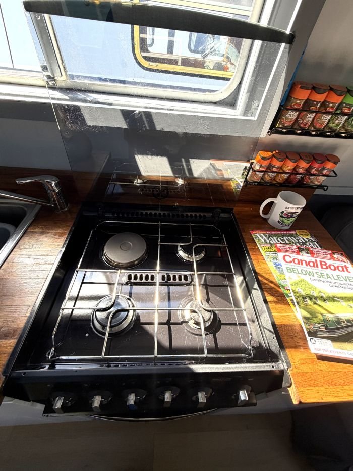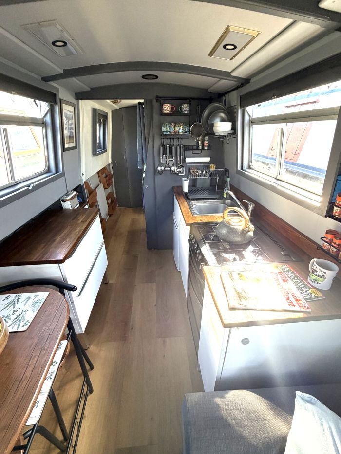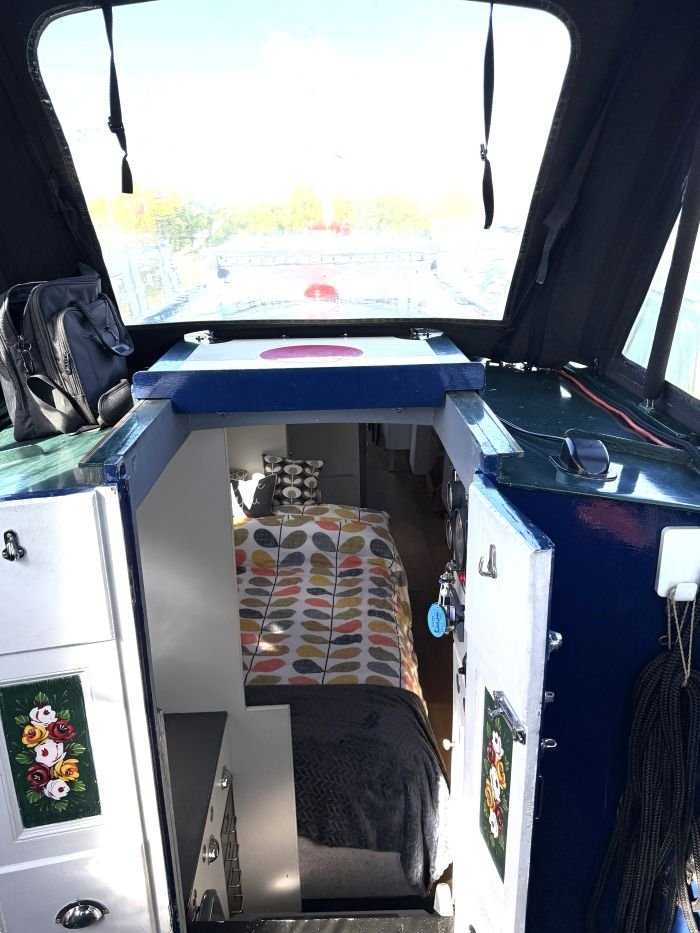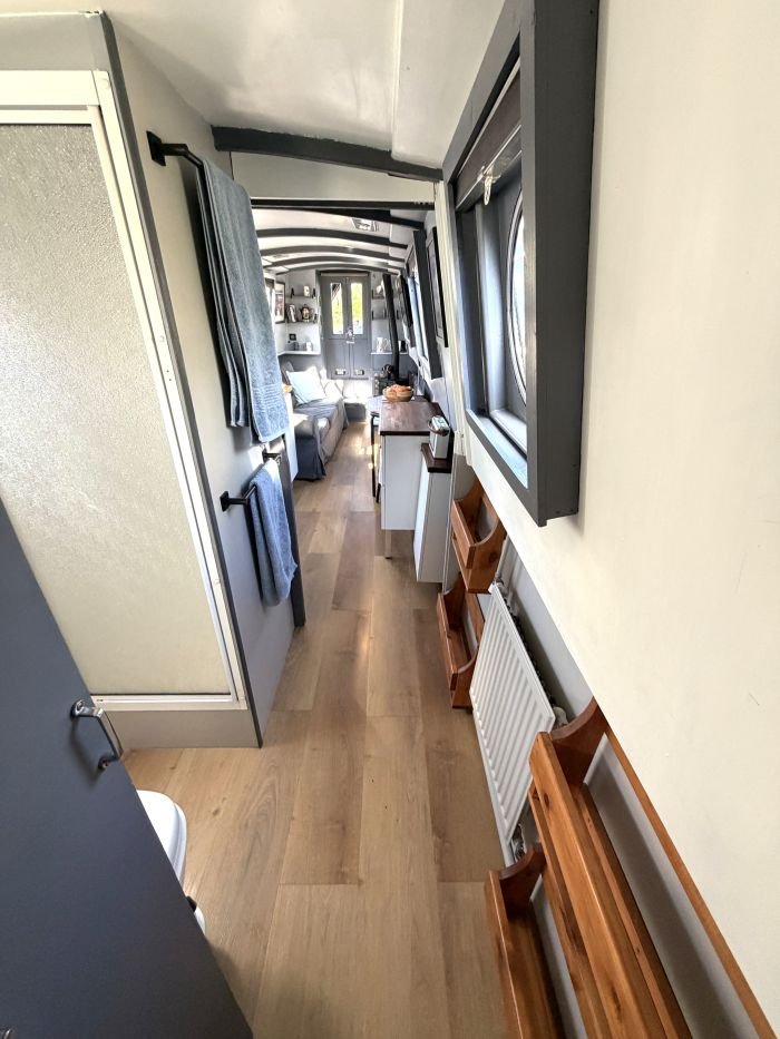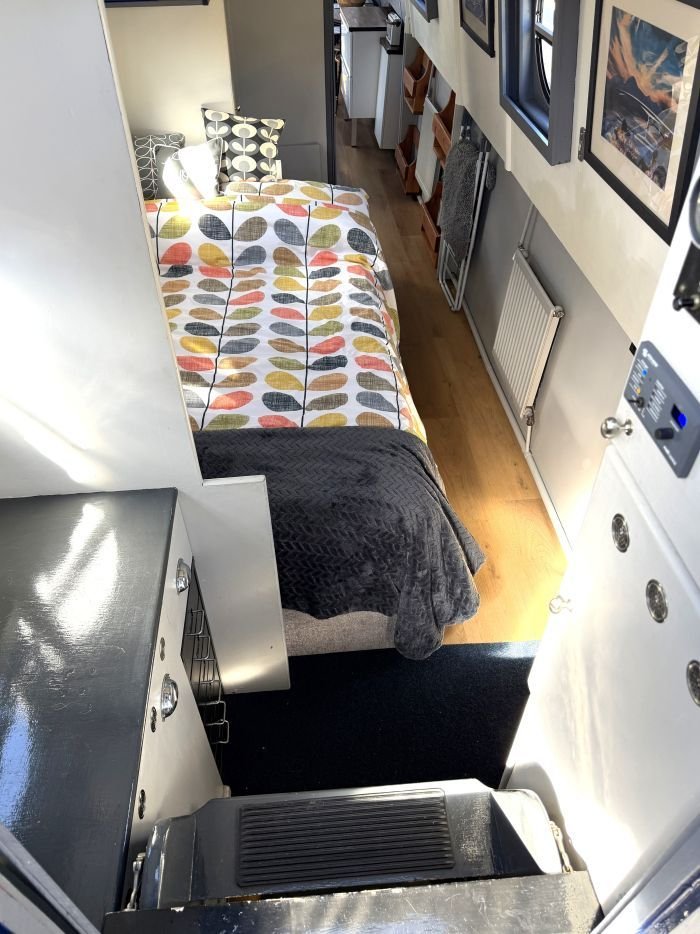 Saloon: Sofa, table & 2 chairs, Bush smart tv, Boatman solid fuel stove, USB charging points, shelves, blinds, radiator, doors to the bow.