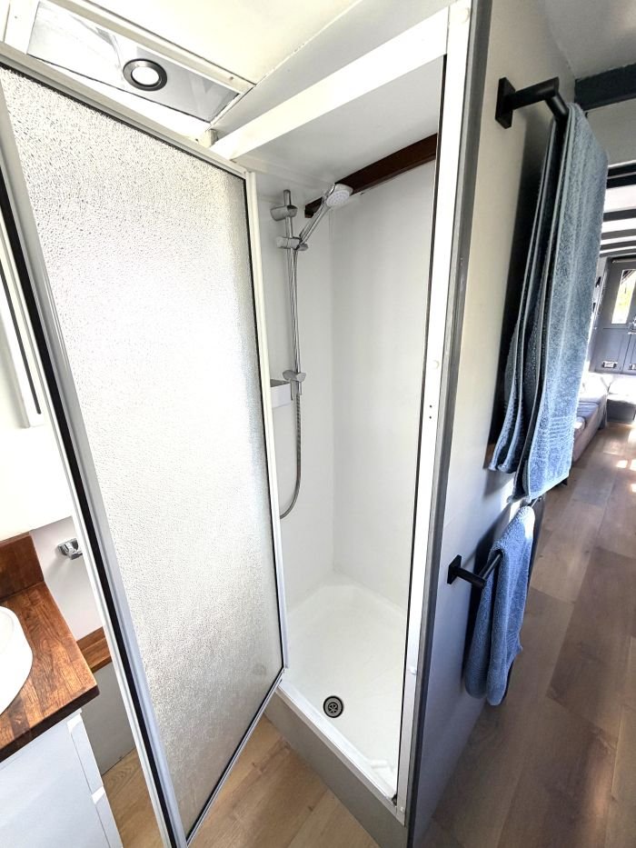 Bathroom: Walk through, wash basin, shower enclosure, Thetford cassette toilet, cupboards, drawer, blinds, radiator