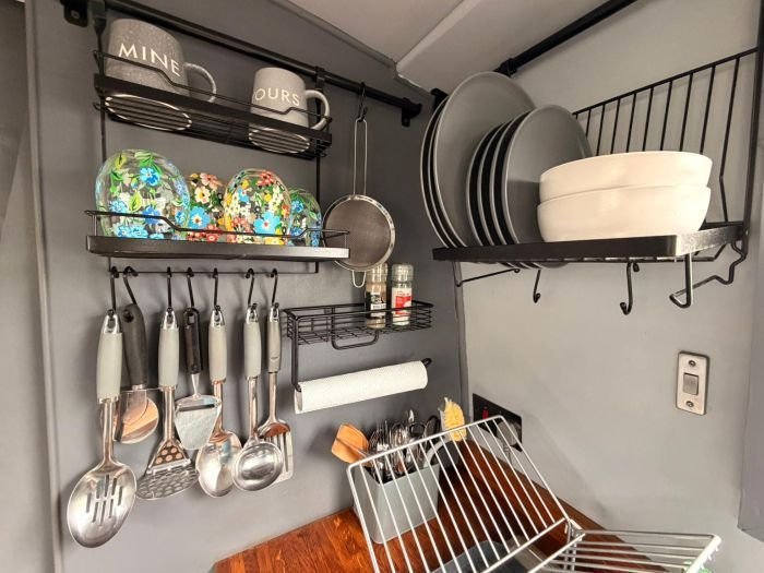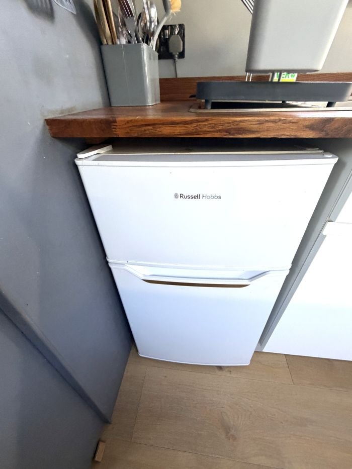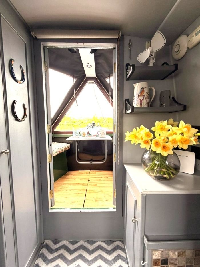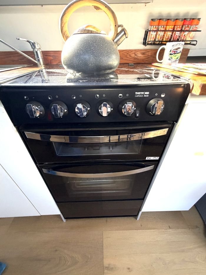 Galley: Thetford Caprice MKIII oven & grill, Russell Hobbs 240v fridge, sink & drainer, cupboards, drawer, blinds.