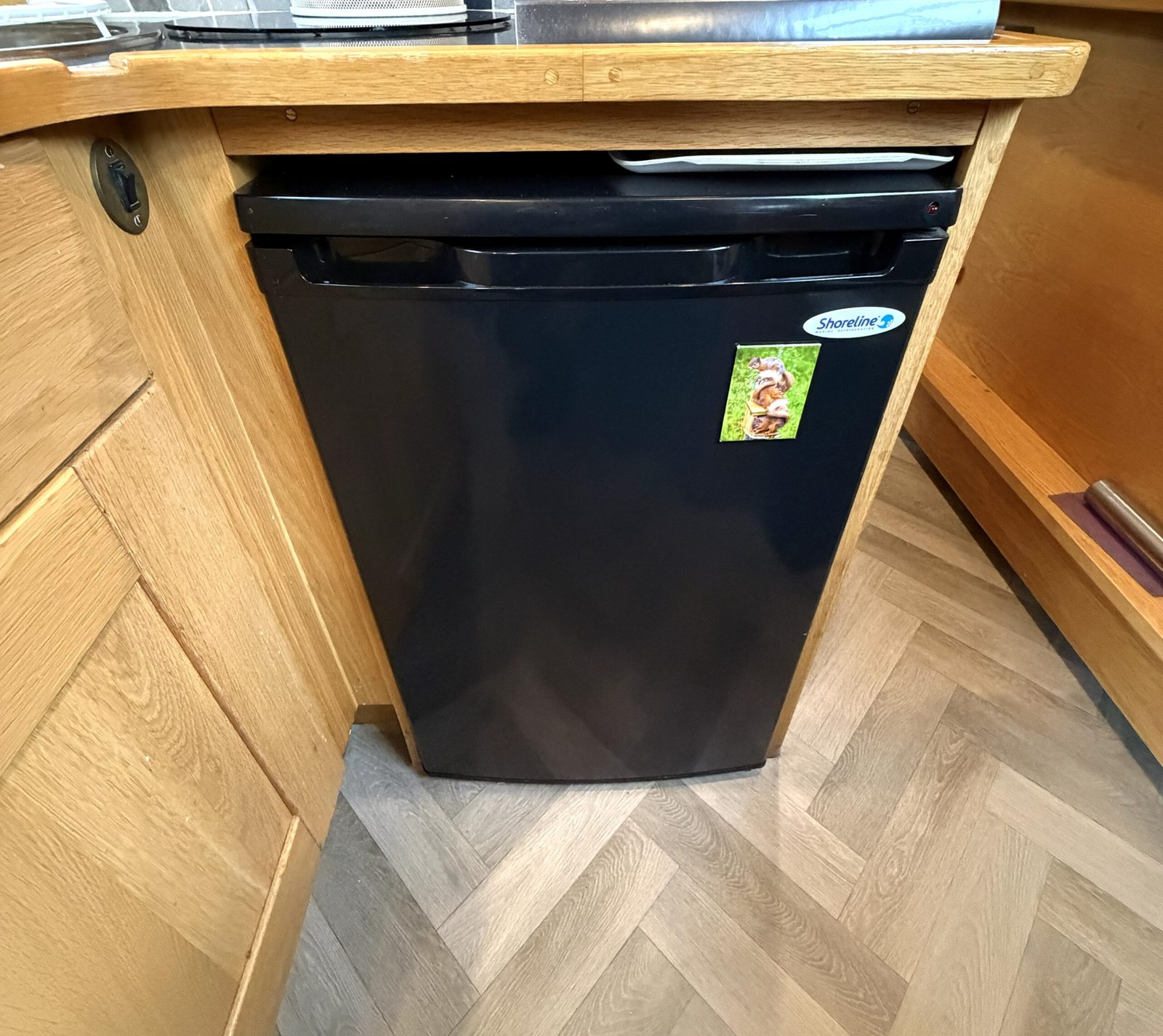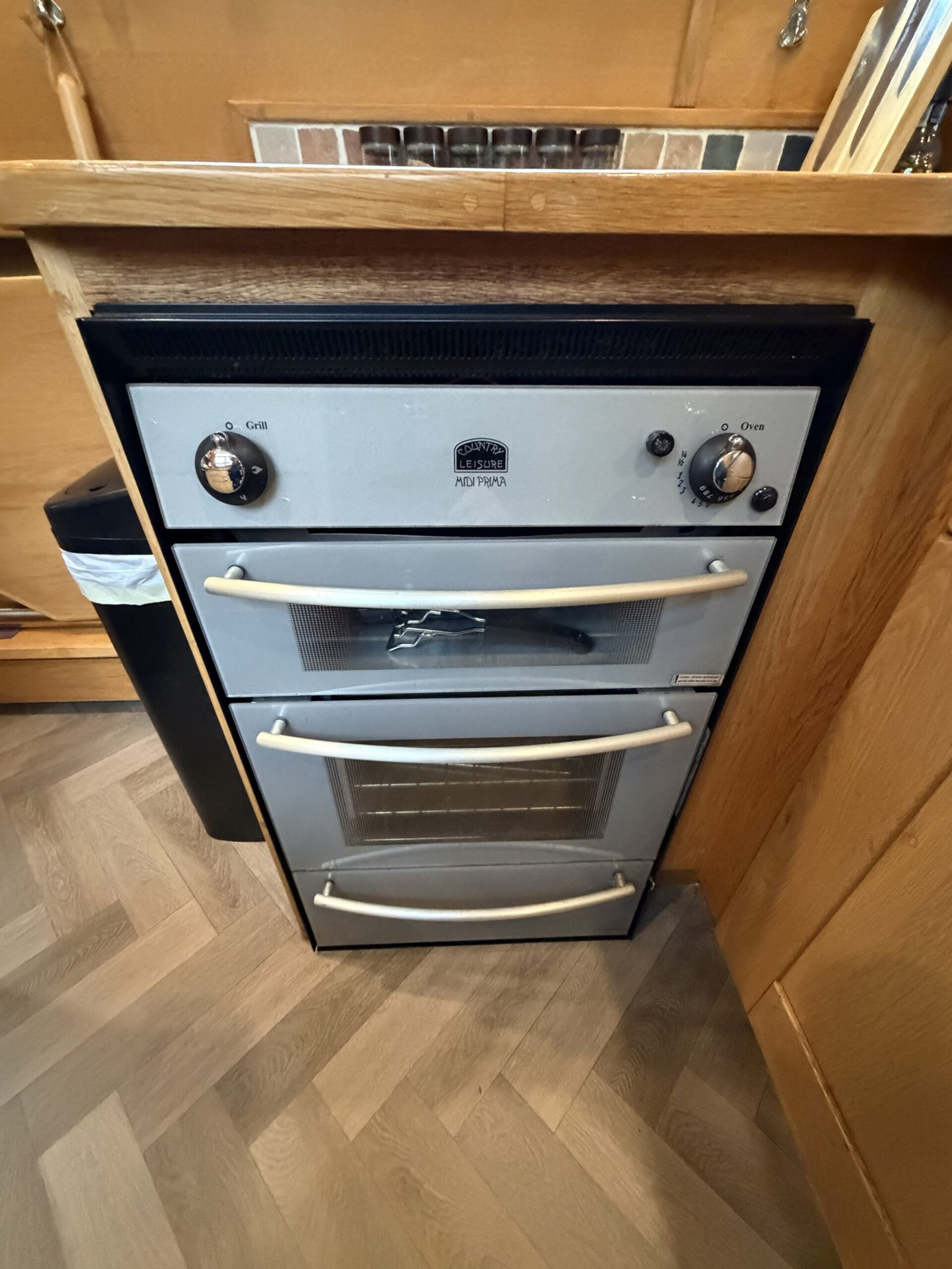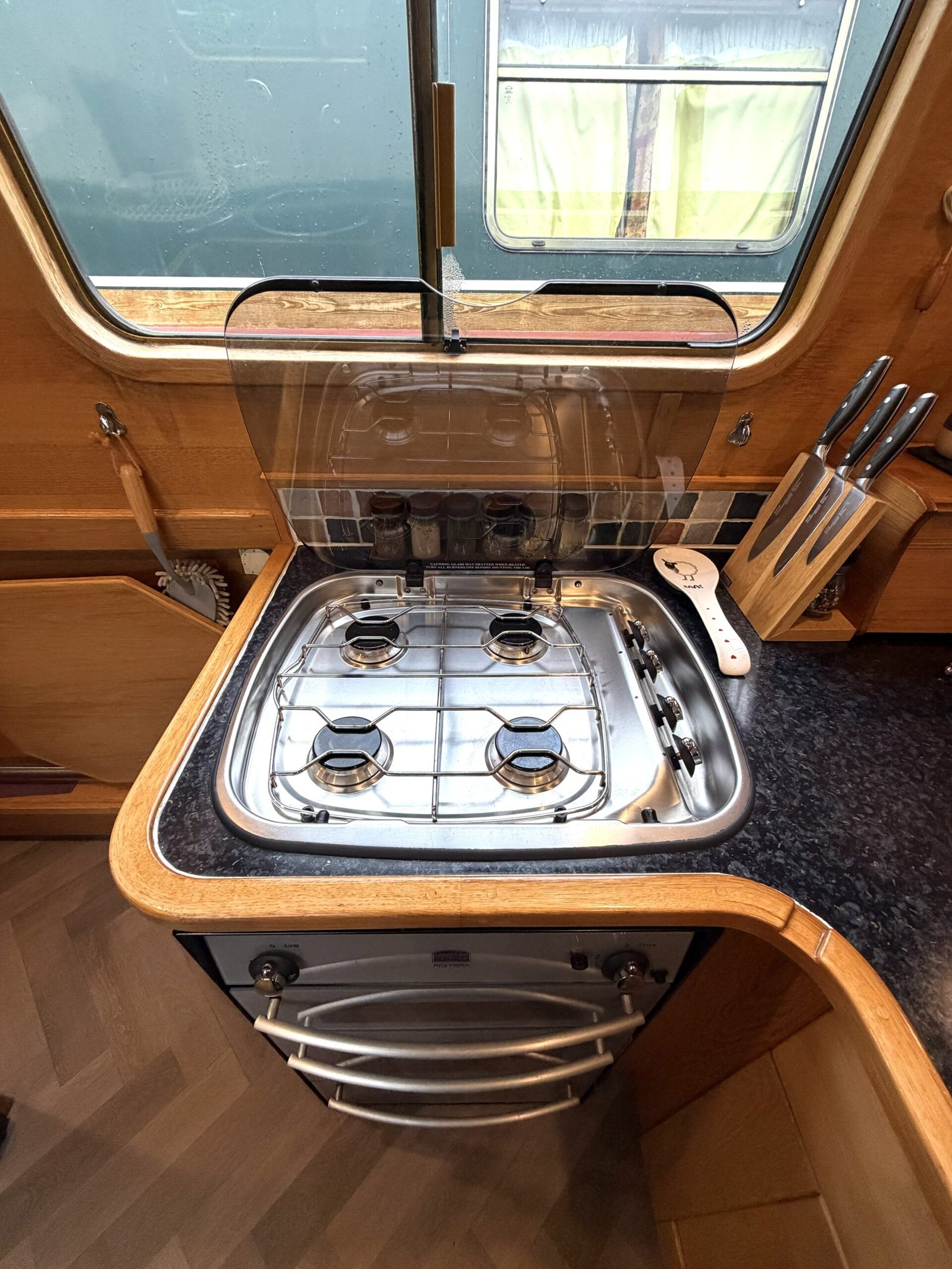 Galley: Fully equipped galley with worktops, Shoreline 12v fridge, Country Leisure Midi Prima oven & grill, hob, larder unit, side hatch, sink, blinds.