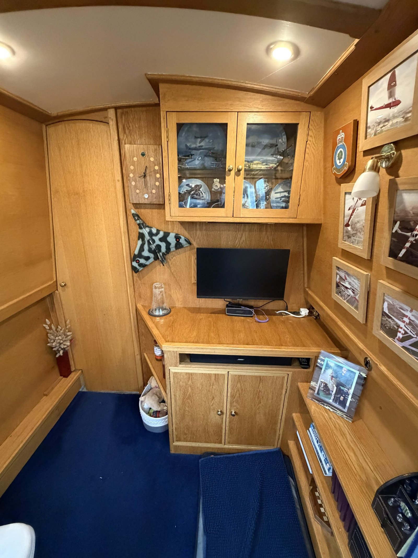 Saloon: Stovax Stockton 4 Clean Burn stove, tv, Bose soundbar, display cabinets, cupboards, shelves, carpet, drop leaf table, chair & footstool.