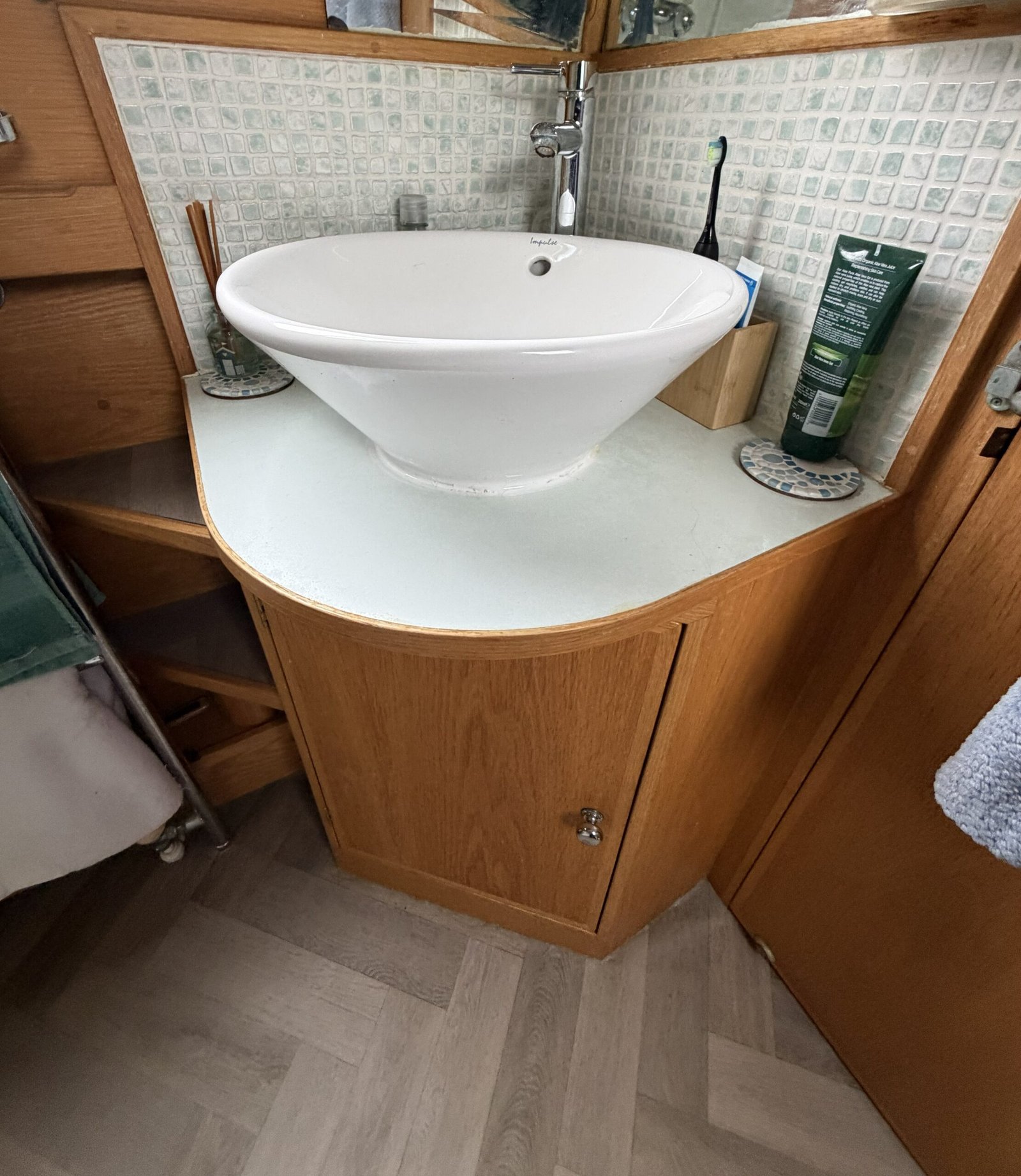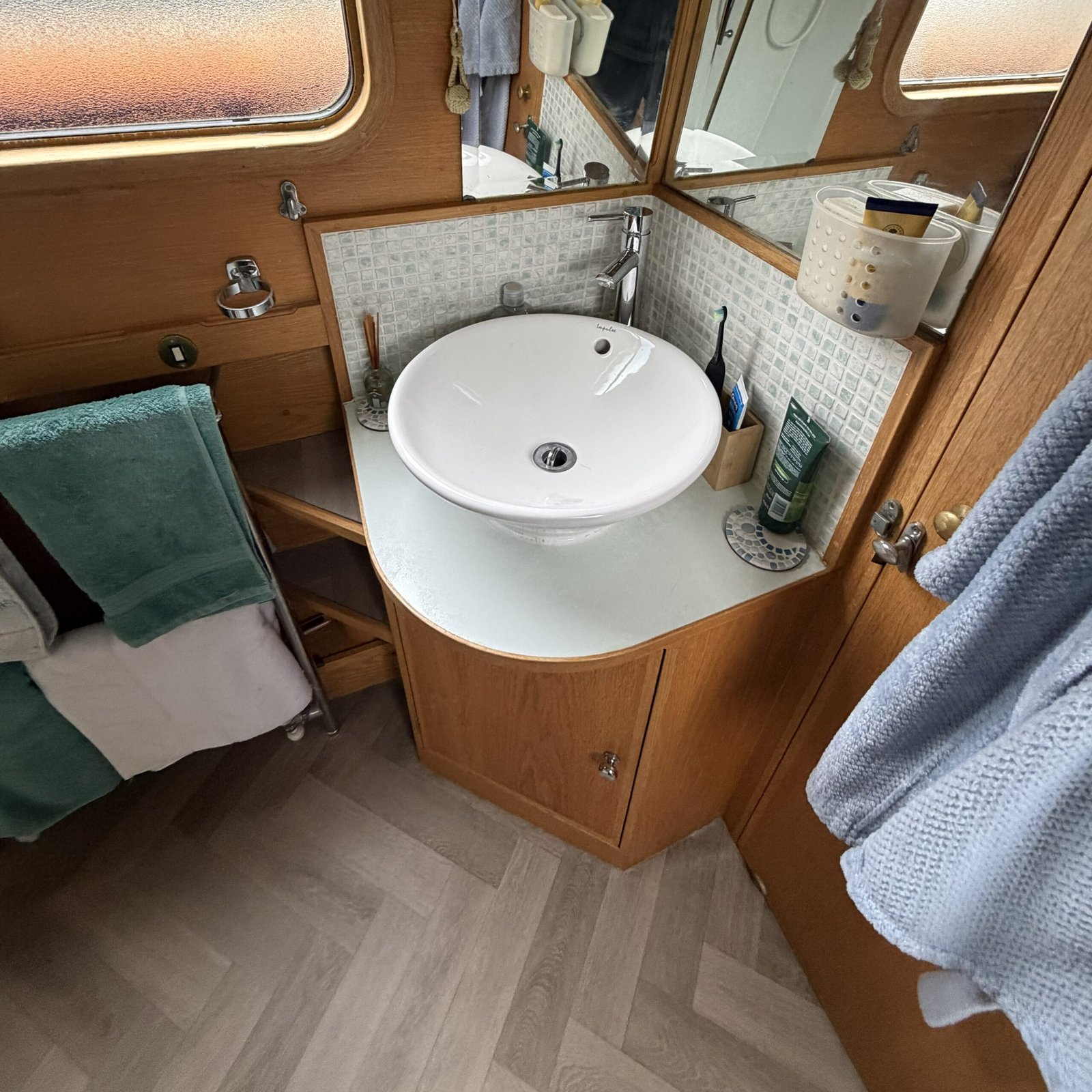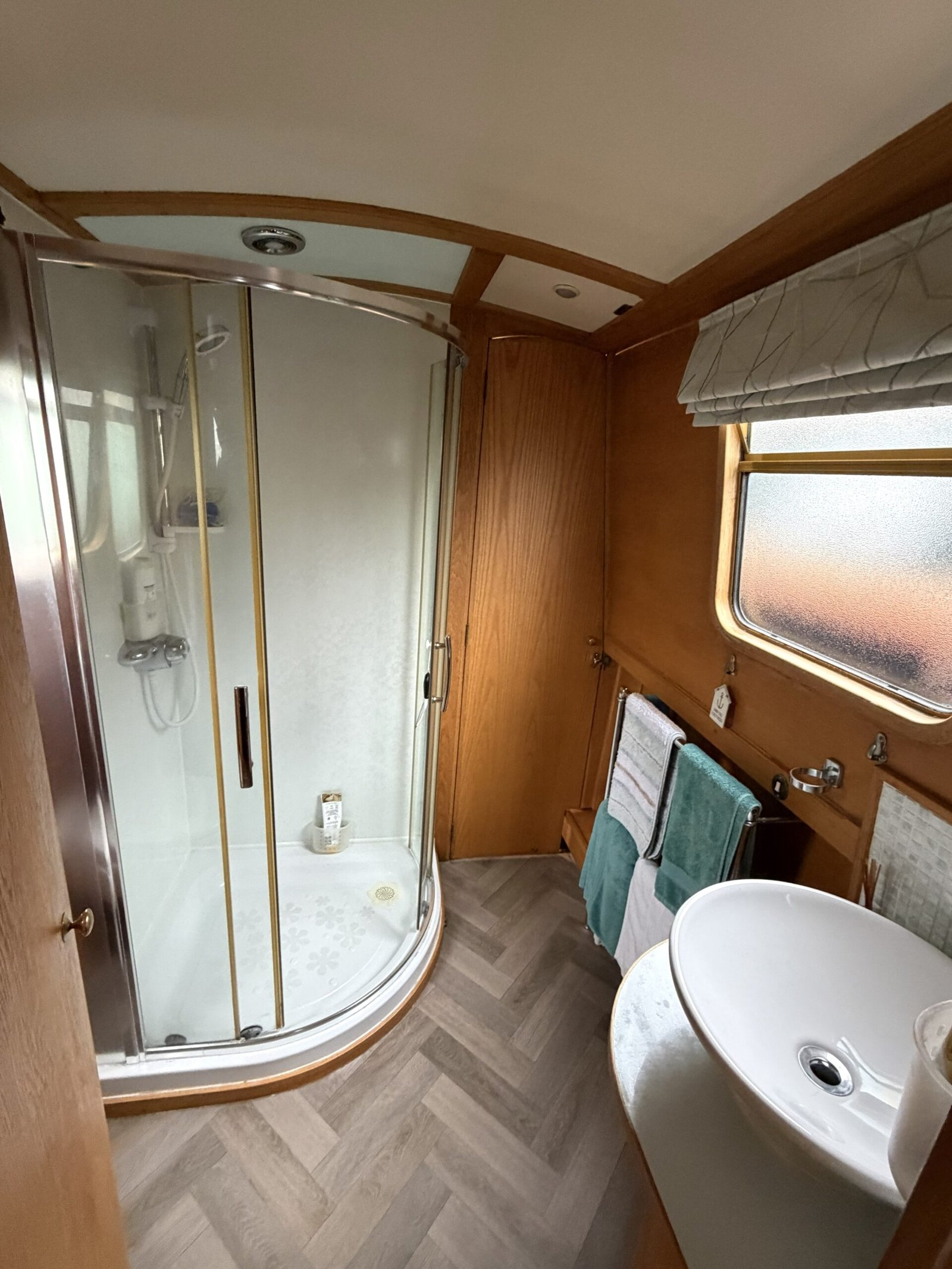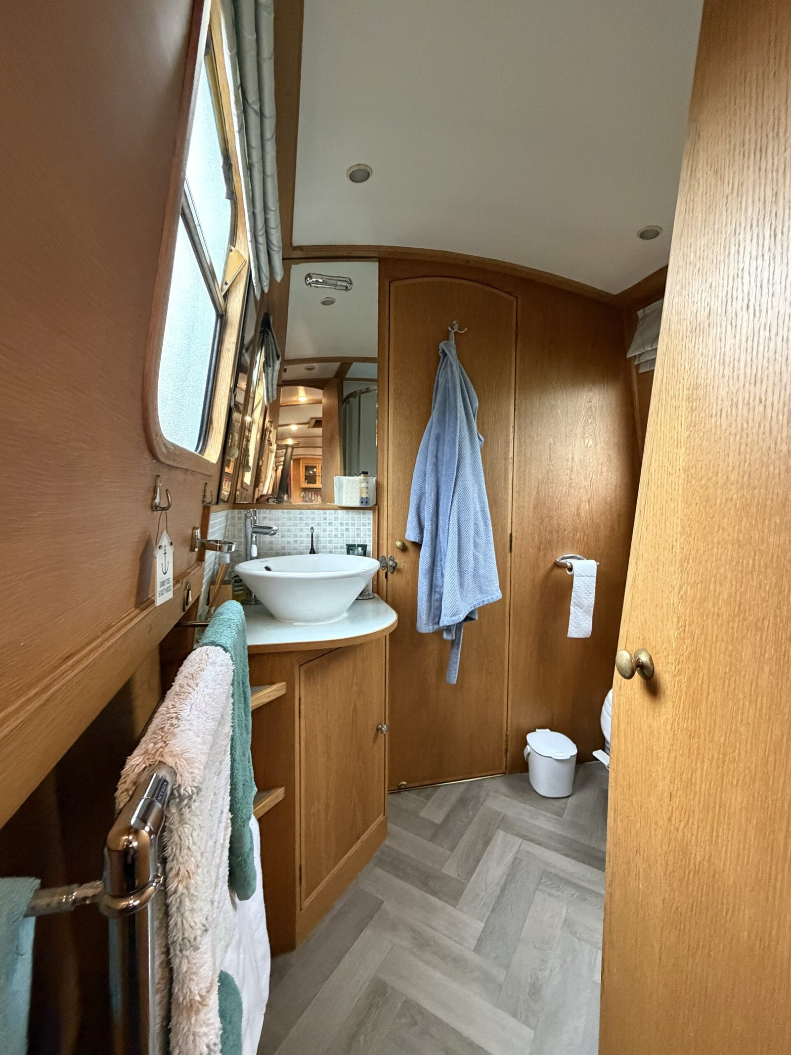 Bathroom: Walk through comprising of shower enclosure, Sealand Vacuflush Dometic pump out toilet, wash basin & vanity unit, heated towel rail, cupboard,shelves.